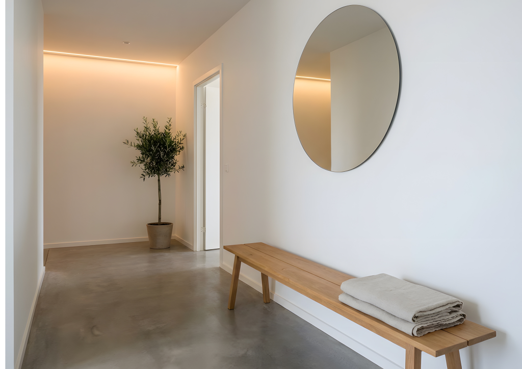 - Rozdeľte priestor na zóny – vstup, zrkadlo, prechody. Každá zóna môže mať iný typ svetla.