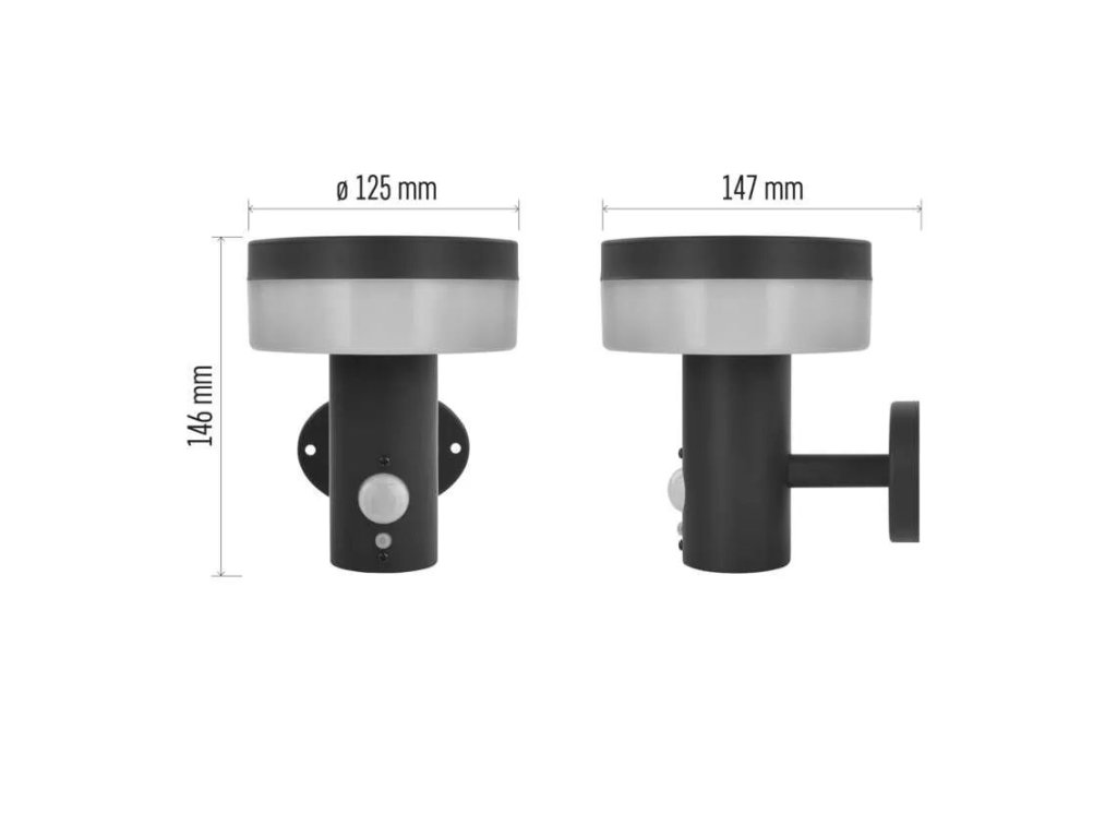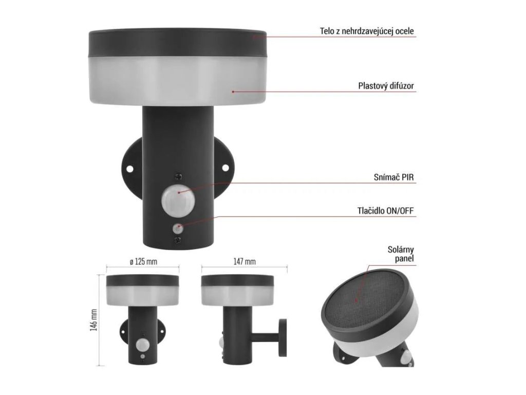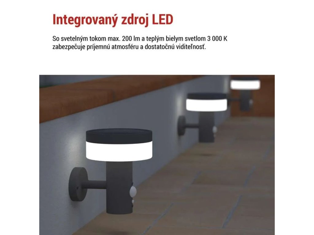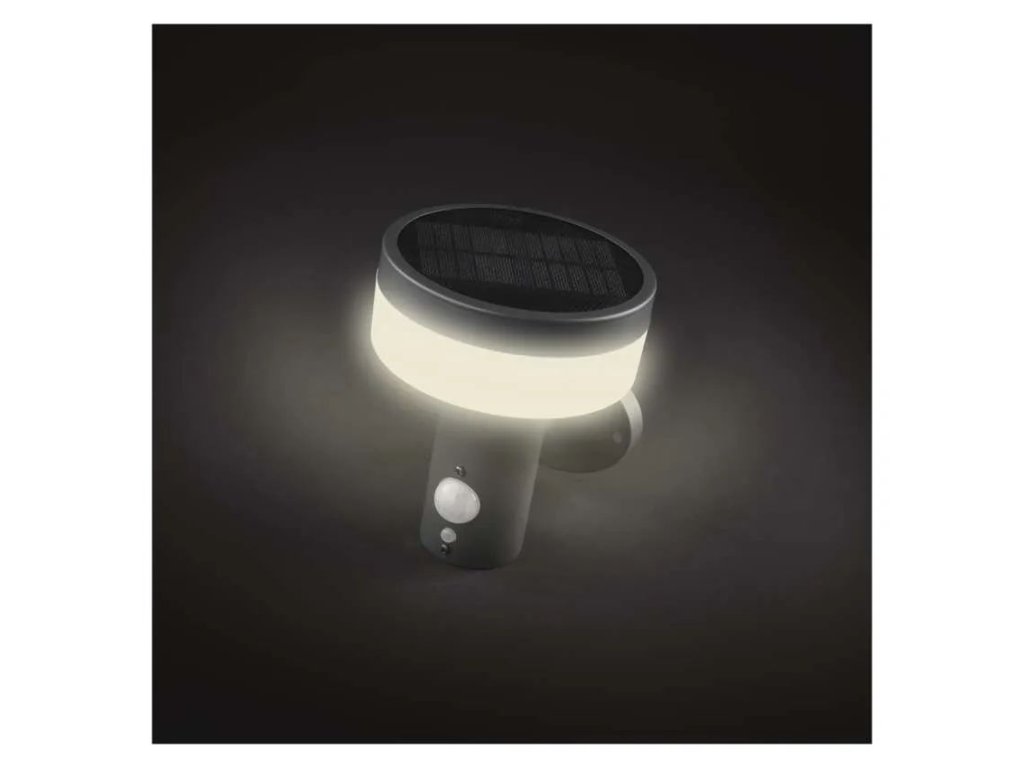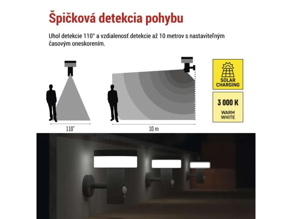 Svietidlo má vstavaný PIR senzor s detekčným uhlom 110° a dosahom až 10 metrov. Reaguje na pohyb a umožňuje nastavenie oneskorenia zhasnutia, takže sa svetlo aktivuje iba vtedy, keď je to naozaj potrebné. K dispozícii sú tri rôzne režimy svietenia, ktoré ľahko prispôsobíte svojim potrebám. Napájanie zaisťuje integrovaný solárny panel, ktorý počas dňa ukladá energiu do vstavaného akumulátora.