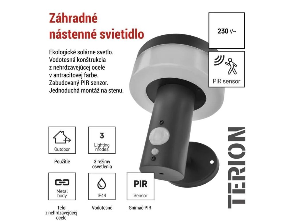 Antracitové fasádne solárne LED svietidlo s pohybovým čidlom Terion 2W IP44