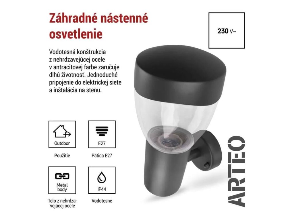 Rozmery svietidla sú 230 mm na výšku, 120 mm na šírku a 164 mm do hĺbky (vzdialenosť od steny). Svietidlo patrí do ucelenej rady ARTEO, ktorá zahŕňa viac typov vonkajšieho osvetlenia pre jednotný vzhľad vašej záhrady alebo domu