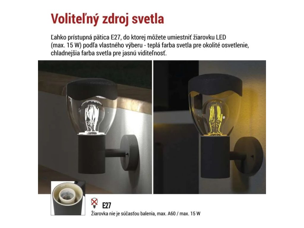 Svietidlo je kompatibilné so žiarovkou s päticou E27 s maximálnym výkonom 15 W a priemerom do 60mm, ktorá nie je súčasťou balenia. Môžete zvoliť teplejší tón pre ambientné osvetlenie alebo studenšiu farbu pre lepšiu viditeľnosť. Žiarovka nie je súčasťou balenia, takže si svetelný zdroj ľahko prispôsobíte svojim preferenciám.