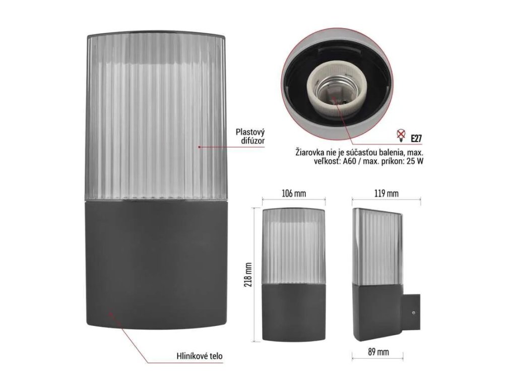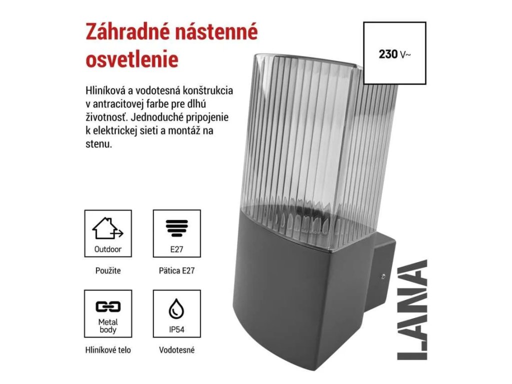 Rozmery svietidla sú 218 mm na výšku, 106 mm na šírku a 119 mm do hĺbky (vzdialenosť od steny). Svietidlo patrí do ucelenej rady LANA, ktorá zahŕňa viac typov vonkajšieho osvetlenia pre jednotný vzhľad vašej záhrady alebo domu.
