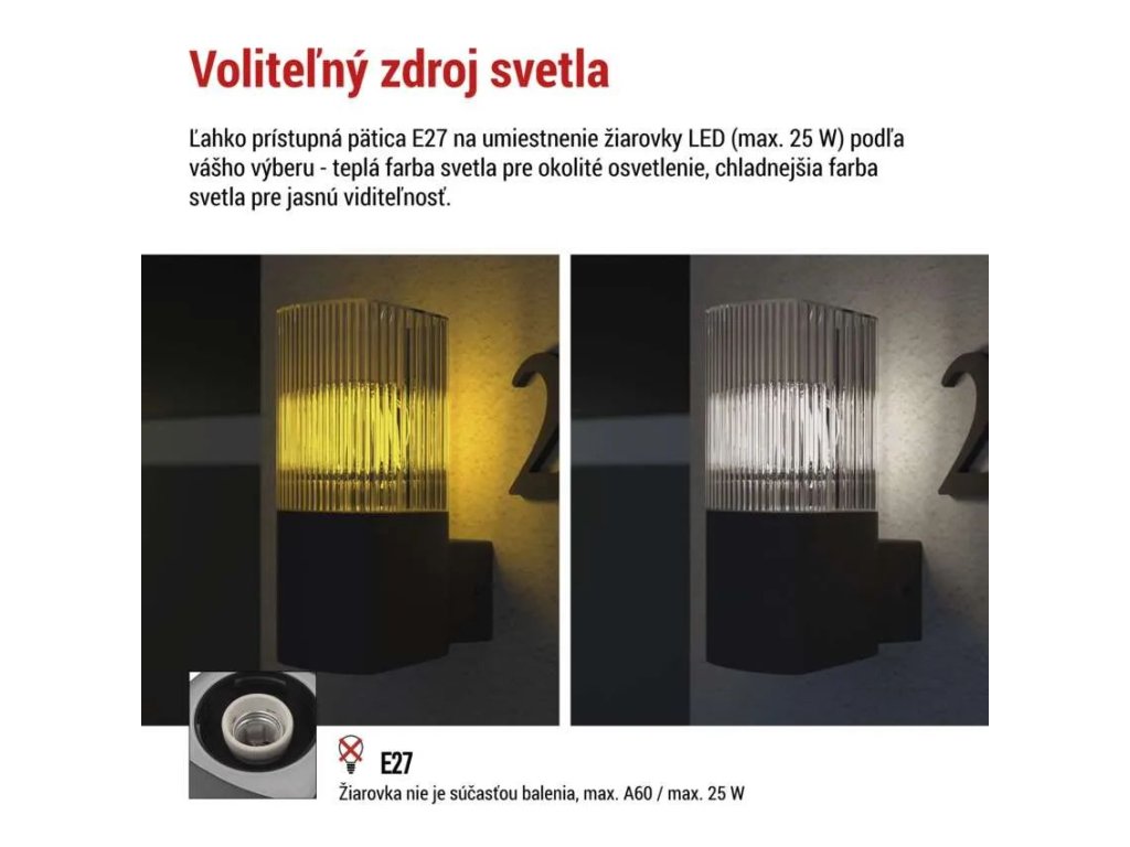 Svietidlo je kompatibilné so žiarovkou s päticou E27 s maximálnym výkonom 25 W, ktorá nie je súčasťou balenia. Môžete zvoliť teplejší tón pre ambientné osvetlenie alebo studenšiu farbu pre lepšiu viditeľnosť. Žiarovka nie je súčasťou balenia, takže si svetelný zdroj ľahko prispôsobíte svojim preferenciám.