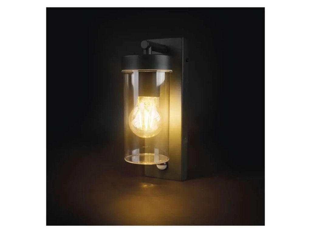 Antracitové fasádne svietidlo s pohybovým čidlom Zala pre žiarovku E27