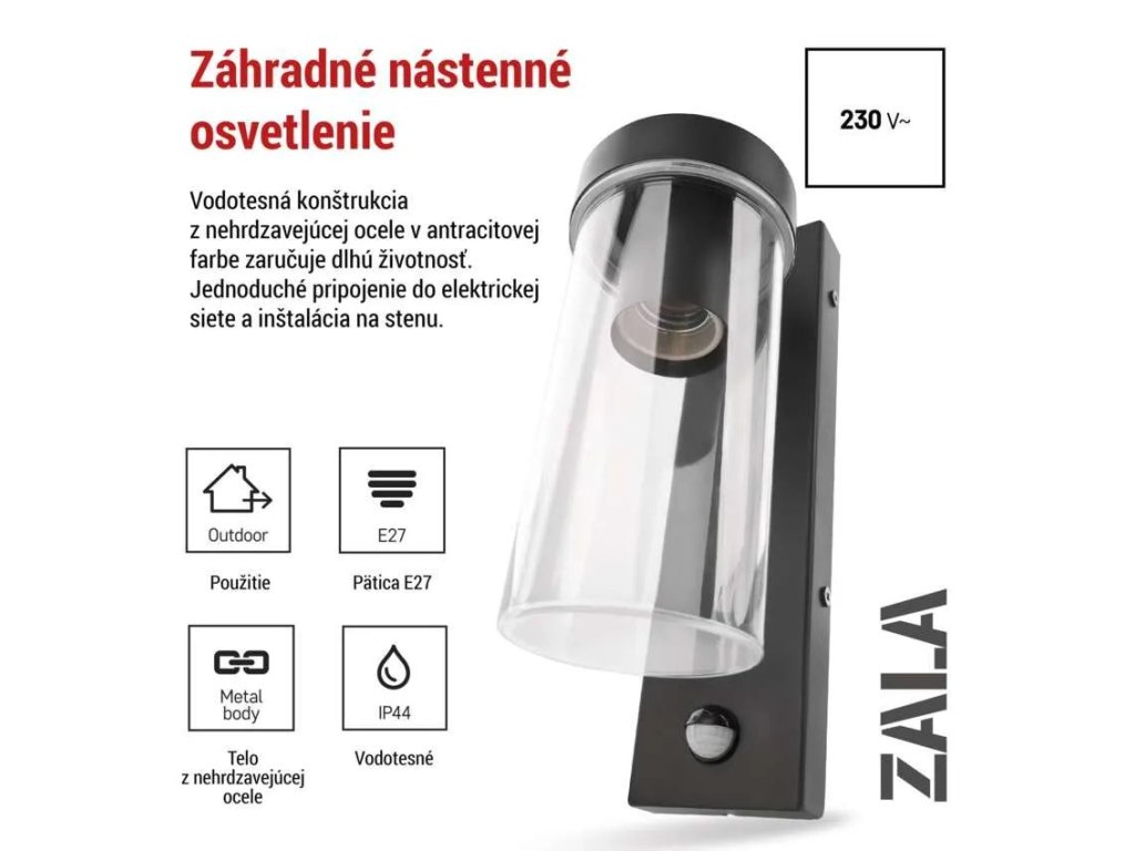Rozmery svietidla sú 230 mm na výšku, 80 mm na šírku a 128 mm do hĺbky (vzdialenosť od steny). Svietidlo patrí do ucelenej rady ZALA, ktorá zahŕňa viac typov vonkajšieho osvetlenia pre jednotný vzhľad vašej záhrady alebo domu.