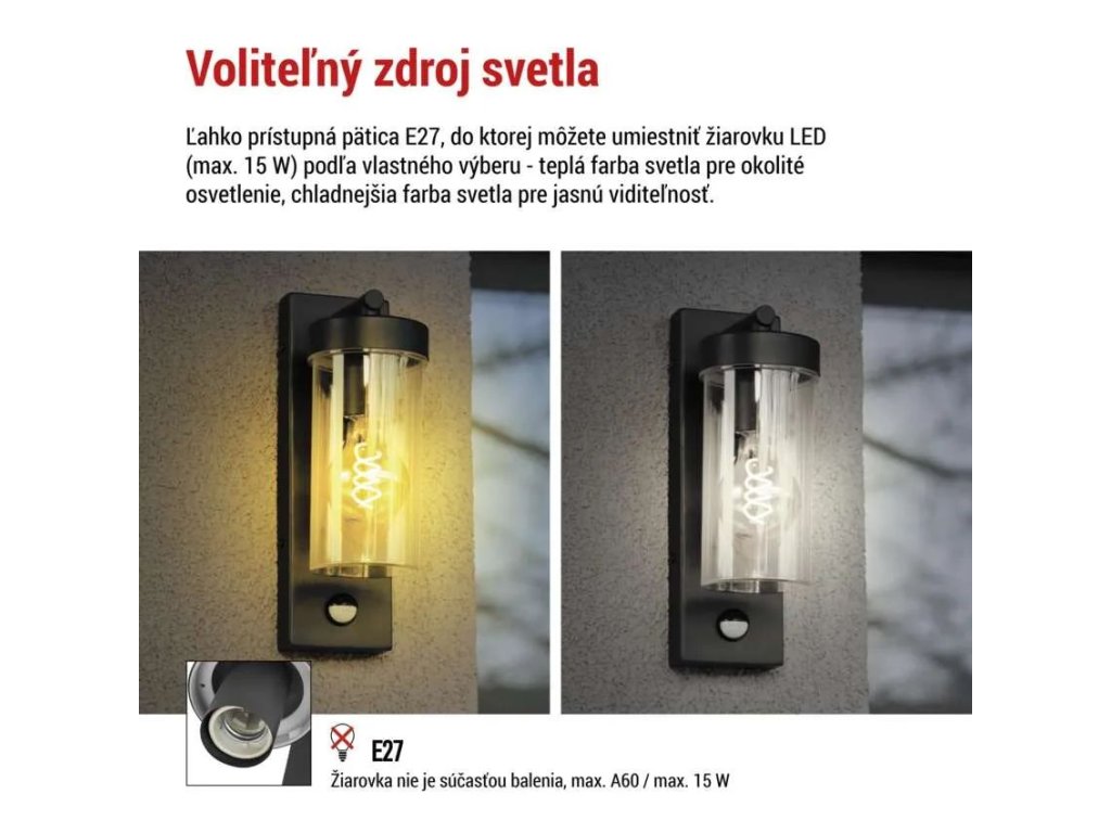 Svietidlo je kompatibilné so žiarovkou s päticou E27 s maximálnym výkonom 15 W, ktorá nie je súčasťou balenia. Môžete zvoliť teplejší tón pre ambientné osvetlenie alebo studenšiu farbu pre lepšiu viditeľnosť. Žiarovka nie je súčasťou balenia, takže si svetelný zdroj ľahko prispôsobíte svojim preferenciám.