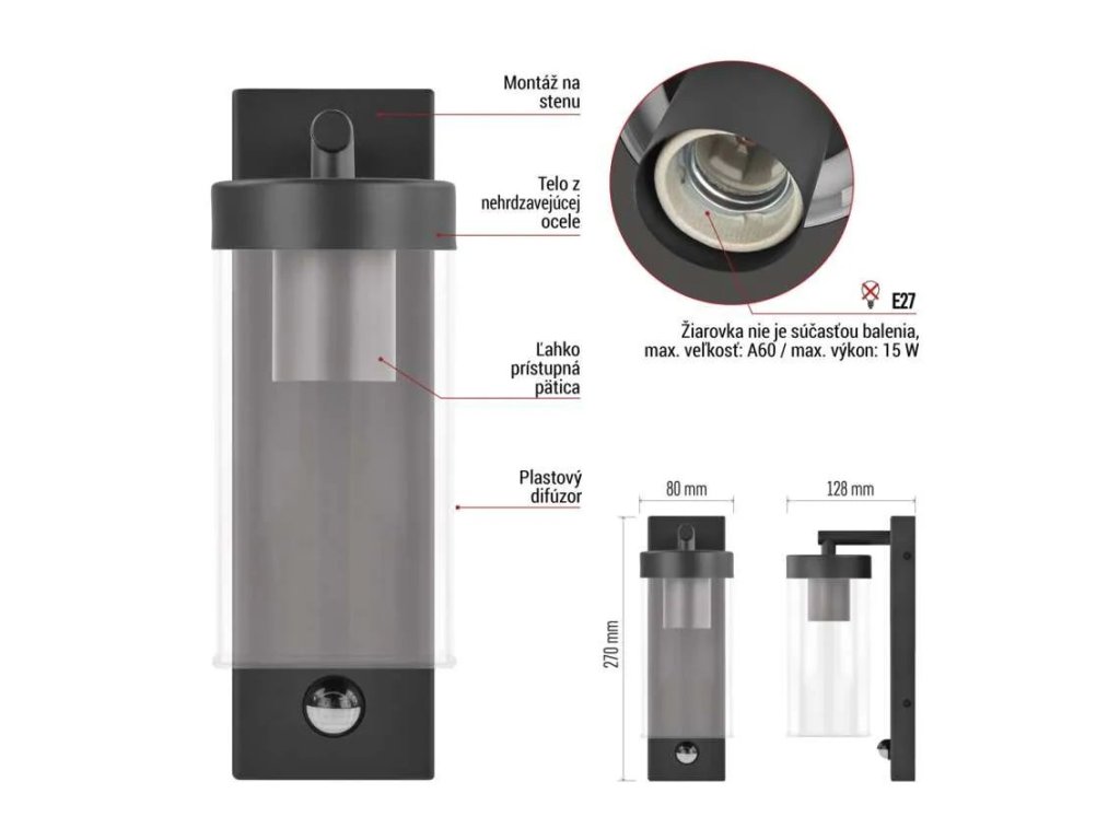 Súčasťou svietidla je pohybové čidlo s dosahom až 10 metrov a snímacím uhlom 110°, ktoré zaistí, že sa svetlo rozsvieti len vtedy, keď je skutočne potrebné.