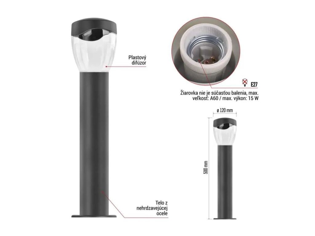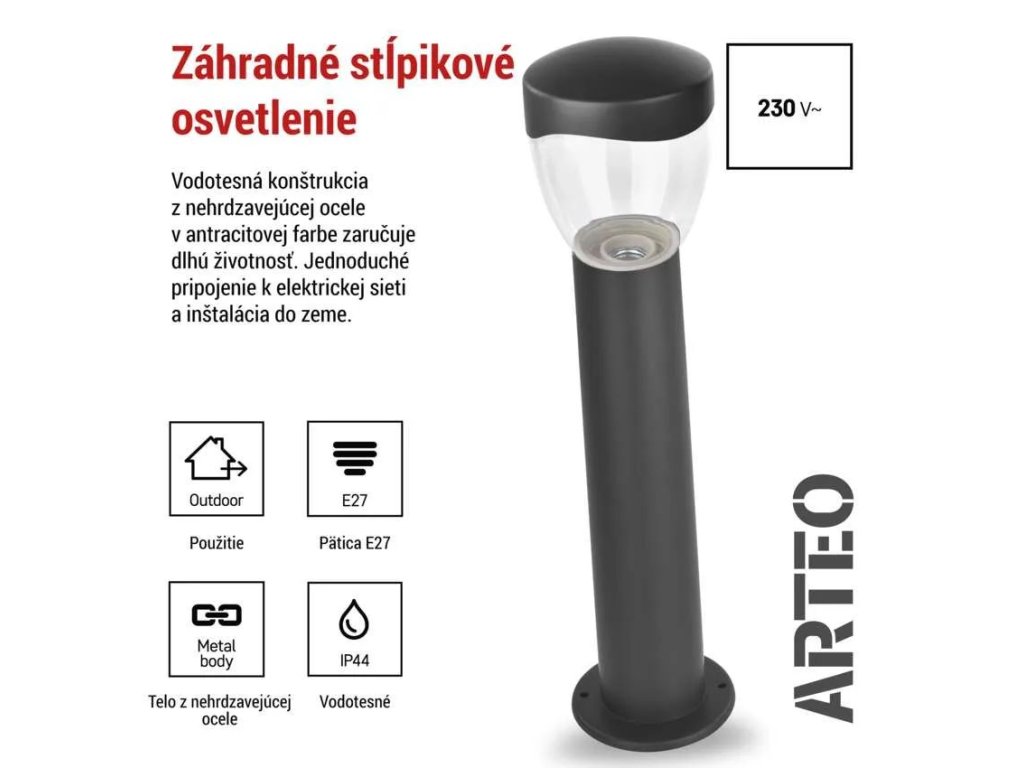 Rozmery svietidla sú 500 mm na výšku a 120 mm v priemere. Patrí do uceleného radu ARTEO, takže ho možno štýlovo kombinovať s fasádnymi svietidlami rovnakého dizajnu pre jednotný vzhľad vašej záhrady aj domu.