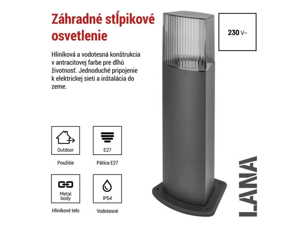 Záhradné stĺpikové svietidlo LANA vyniká moderným dizajnom, kvalitným spracovaním a odolnosťou voči vonkajším podmienkam. Hliníkové telo v antracitovej farbe pôsobí elegantne a nenápadne, zatiaľ čo ryhovaný plastový difúzor zaisťuje rovnomerné a príjemné osvetlenie okolia. Svietidlo je ideálne na inštaláciu pozdĺž chodníkov, príjazdových ciest, na terasách alebo v okolí vstupných priestorov.
