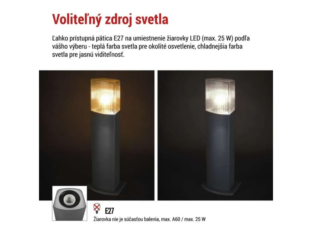 Svietidlo je vybavené päticou E27 pre LED žiarovku s maximálnym výkonom 25 W, ktorá nie je súčasťou balenia. Vďaka tomu si môžete zvoliť farbu svetla podľa potreby – teplejší odtieň na vytvorenie príjemnej atmosféry alebo chladnejšiu pre lepšiu viditeľnosť v noci.
