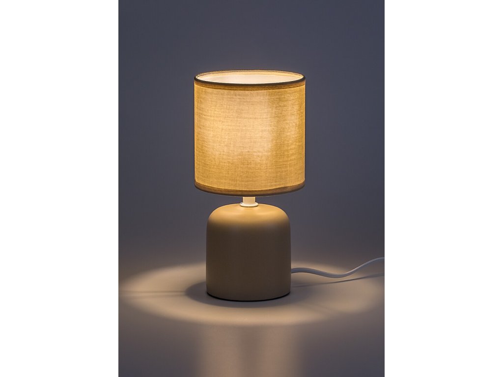 Telo lampičky je vyrobené z béžovej keramiky a dopĺňa ho valcové textilné tienidlo, ktoré je otvorené zhora aj zdola. Vďaka tomu svetlo príjemne presvitá a rovnomerne osvetľuje okolitý priestor.