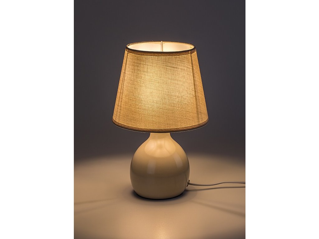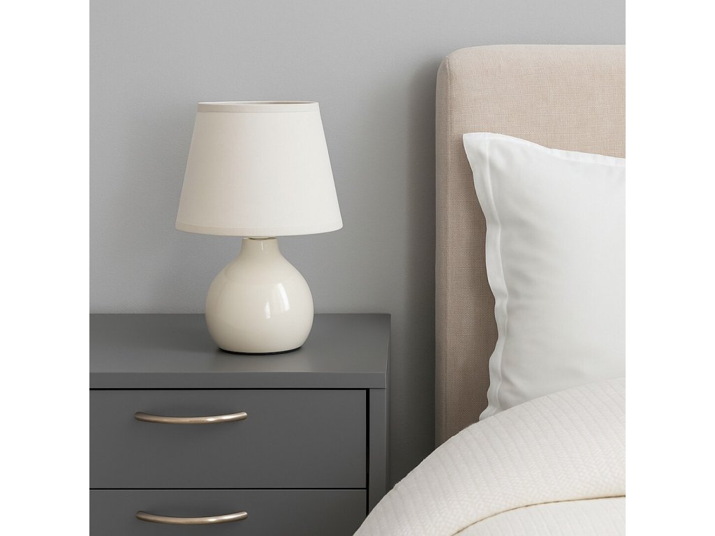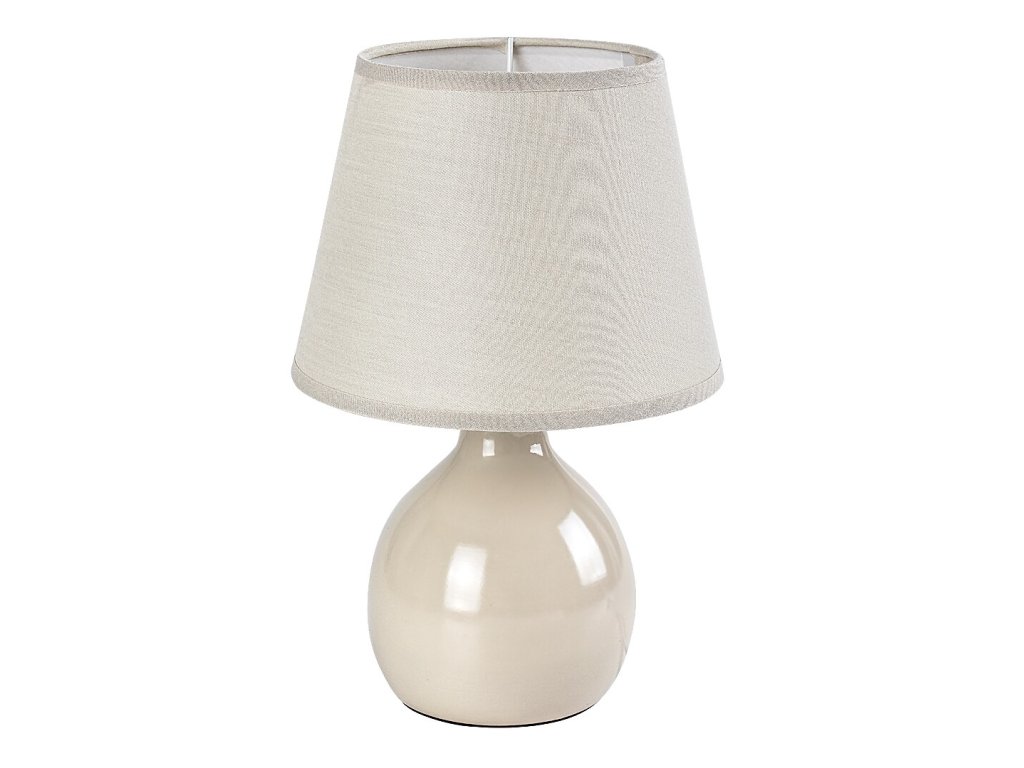 Telo lampy je vyrobené z lesklej béžovej keramiky a dopĺňa ho textilné tienidlo v rovnakom farebnom odtieni, ktoré sa smerom nadol mierne rozširuje. Tienidlo je otvorené zhora aj zdola, takže svetlo prirodzene preniká do priestoru a pôsobí mäkko a rovnomerne. Vďaka svetlému vyhotoveniu je lampa vhodná nielen ako dekoratívne osvetlenie, ale aj ako praktická čítacia lampička.