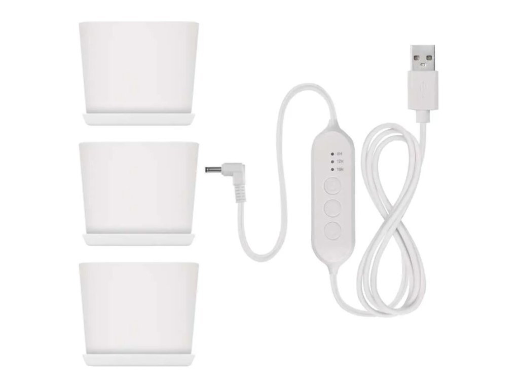 Lampa je napájaná pomocou USB-A kábla s dĺžkou 1,7 m, čo umožňuje pripojenie k USB adaptéru, powerbanke alebo počítaču. Ovládanie je umiestnené priamo na kábli a ponúka zabudovaný časovač s režimami 8, 12 alebo 16 hodín a päťstupňové stmievanie, vďaka ktorému je možné jednoducho nastaviť intenzitu osvetlenia podľa typu rastlín alebo dennej doby. Svietidlo tak podporuje prirodzený denný rytmus bez potreby každodenného manuálneho ovládania.