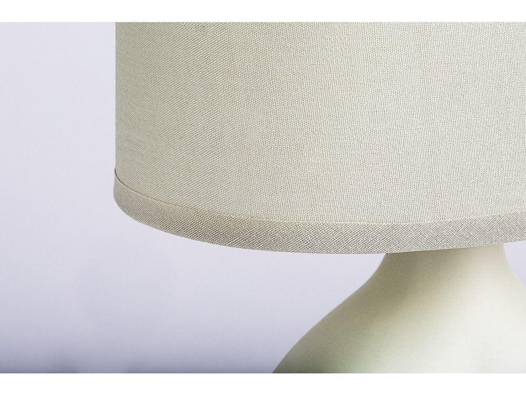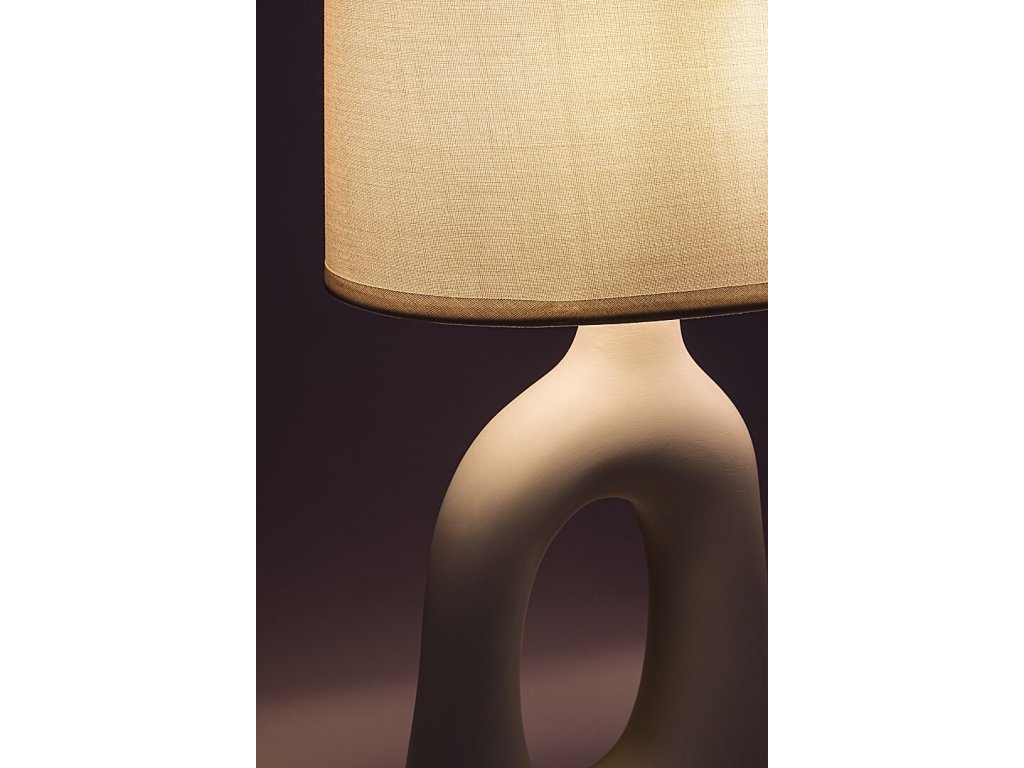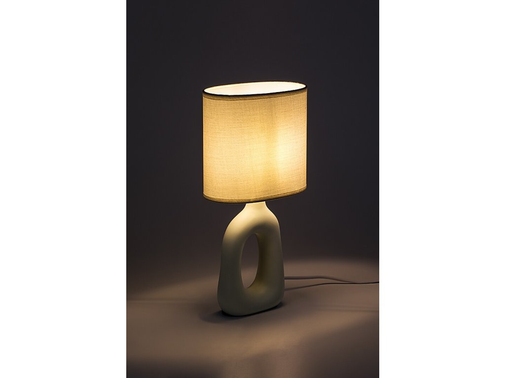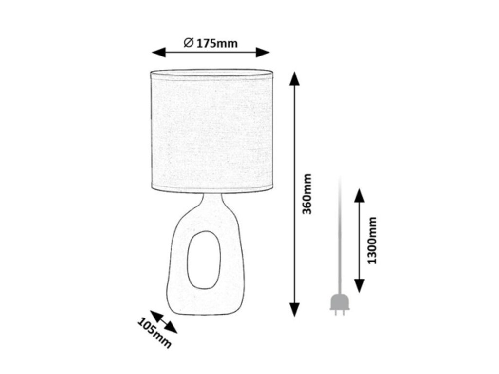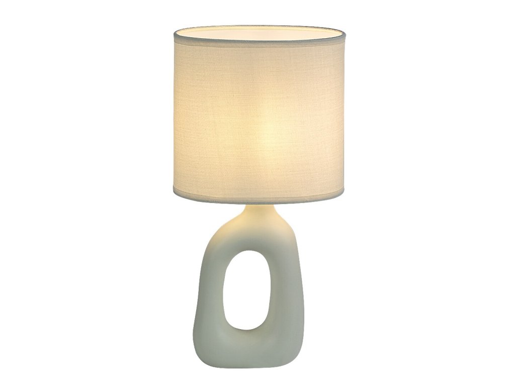 Stolná lampička Sylira zaujme svojim originálnym keramickým telom s výrazným otvorom uprostred, ktoré pôsobia moderne a elegantne. Biele textilné tienidlo valcovitého tvaru prepúšťa dostatok svetla zhora aj zdola a skvele dopĺňa celkový dizajn lampy.