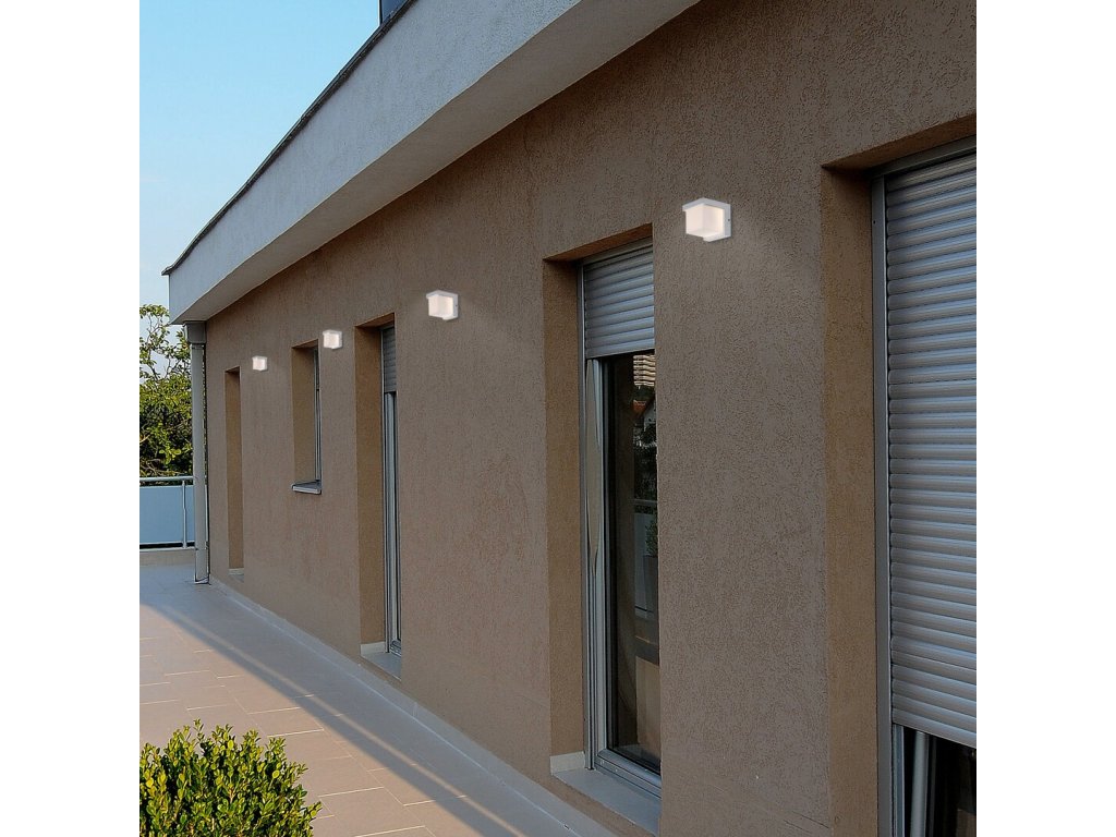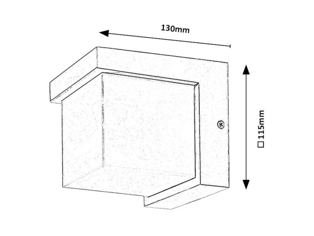 Svietidlo má rozmery 115 x 115 mm a vzdialenosť od steny je 130 mm. Vďaka svojmu geometrickému tvaru a univerzálnemu designu poskytuje účinné osvetlenie vo viacerých smeroch a štýlovo doplní každý moderný exteriér.