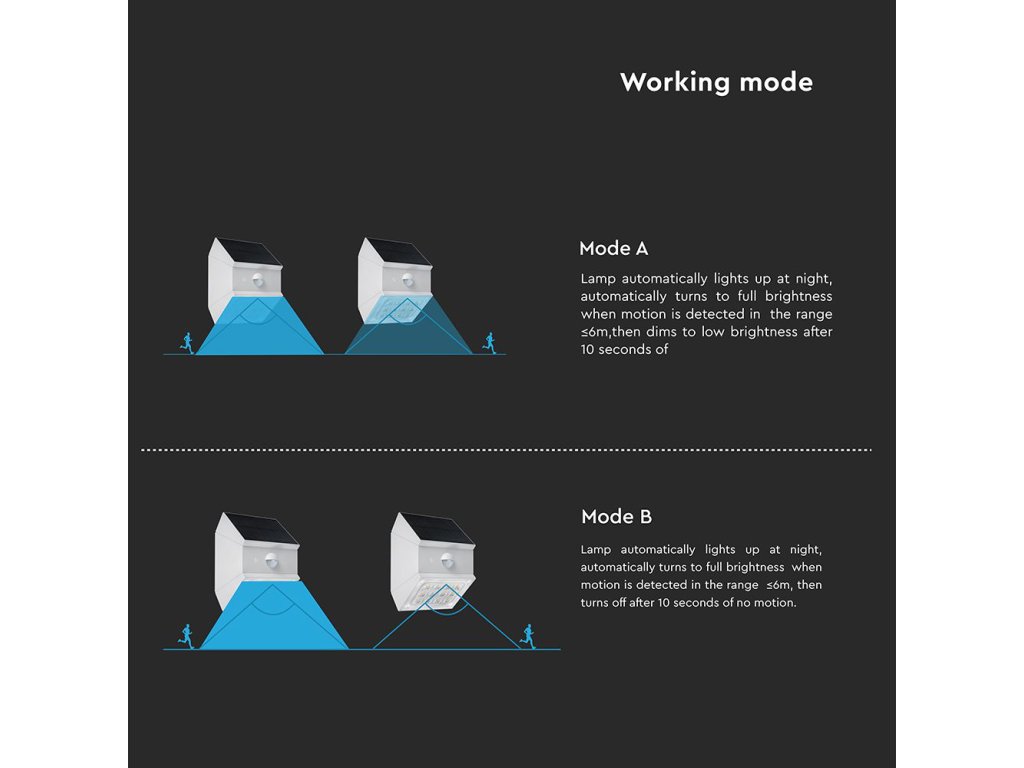 Režim 1: Svietidlo sa v noci automaticky aktivuje, pri detekcii pohybu v dosahu ≤6 m svieti na plný jas a po 10 sekundách bez pohybu sa stlmí na nízky jas.