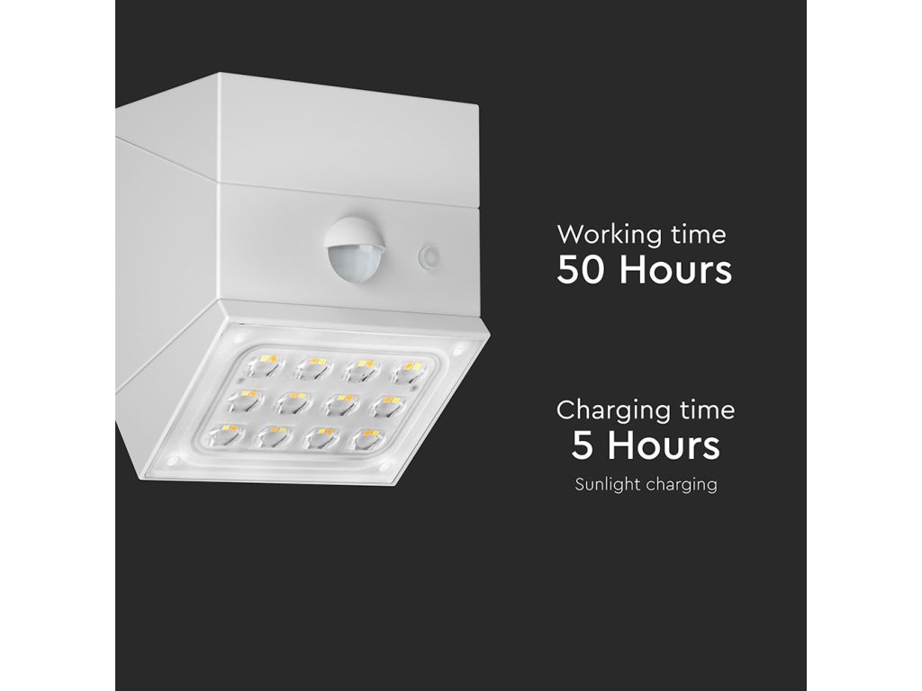 Svietidlo využíva monokryštalický solárny panel na nabíjanie integrovanej lítium batérie 3,7 V / 1200 mAh, ktorá umožňuje až 50 hodín prevádzky na jedno nabitie. Nabíjanie prebieha iba slnečnou energiou a trvá približne 5 hodín. Po zotmení sa svetlo automaticky aktivuje vďaka súmrakovému čidlu a pri detekcii pohybu v dosahu až 6 metrov a uhle 120° sa rozsvieti na plný výkon. Výkon 2,5 W a svetelný tok 300 lm poskytujú dostatok svetla pre bezpečný pohyb pri vstupných dverách, pozdĺž chodníka alebo na terase.