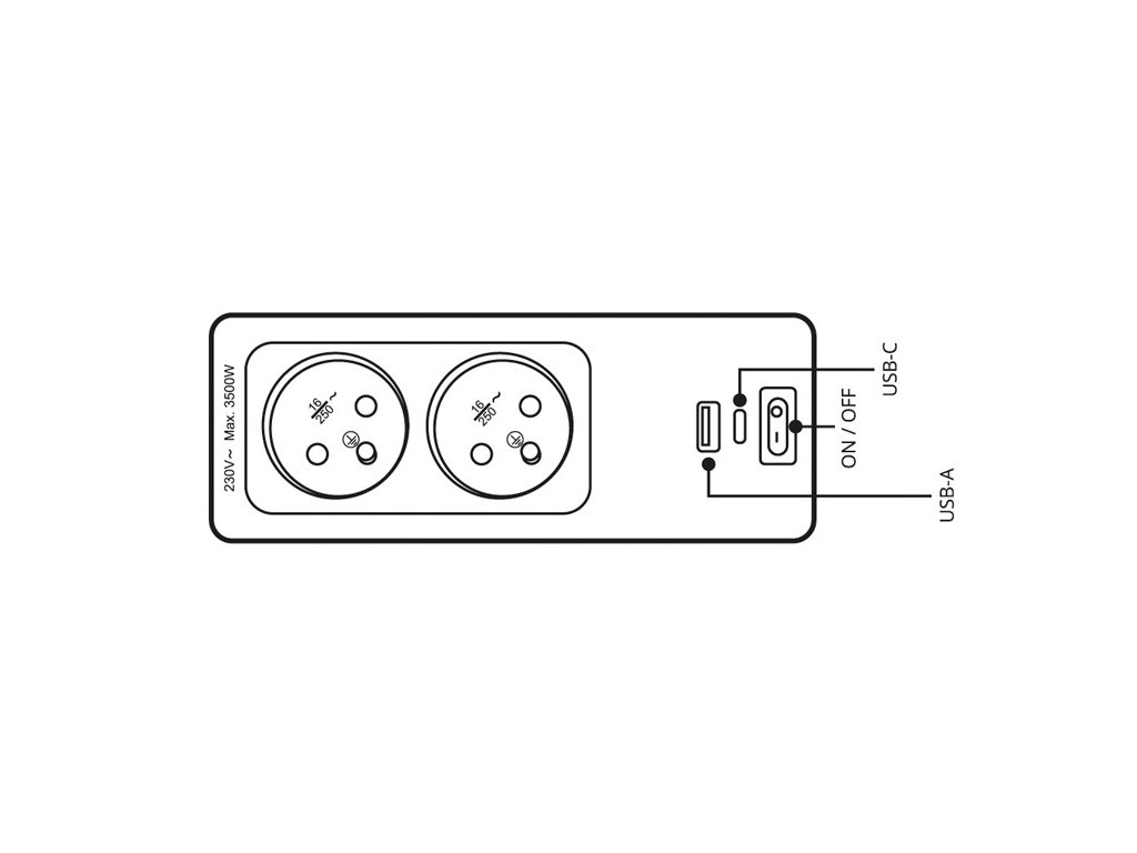 Praktickým bonusom sú dve integrované zásuvky s maximálnym zaťažením až 3500 W a taktiež porty USB-A a USB-C, ktoré rozširujú využitie svietidla o možnosť napájania alebo dobíjania menších elektronických zariadení priamo na mieste. Všetky funkcie je možné pohodlne ovládať pomocou vypínača umiestneného priamo na tele svietidla. Prívodný kábel je možné pripojiť flexibilne - buď zo zadnej strany, alebo z boku, kde je pripravená odnímateľná plastová krytka pre jednoduché napojenie.