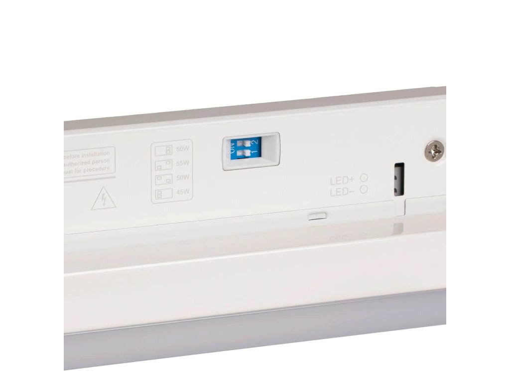Svietidlo umožňuje nastaviť 4 hodnoty výkonu prostredníctvom DIP prepínača umiestneného na tele zdroja. Pri inštalácii si tak môžete zvoliť presnú intenzitu osvetlenia podľa charakteru priestoru a požadovanej svetelnej úrovne: