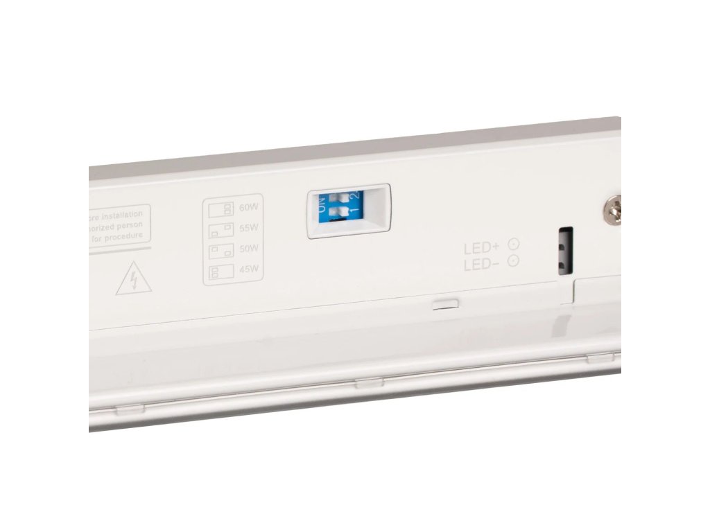 Svietidlo umožňuje nastaviť 4 hodnoty výkonu prostredníctvom DIP prepínača umiestneného na tele zdroja. Pri inštalácii si tak môžete zvoliť presnú intenzitu osvetlenia podľa charakteru priestoru a požadovanej svetelnej úrovne: