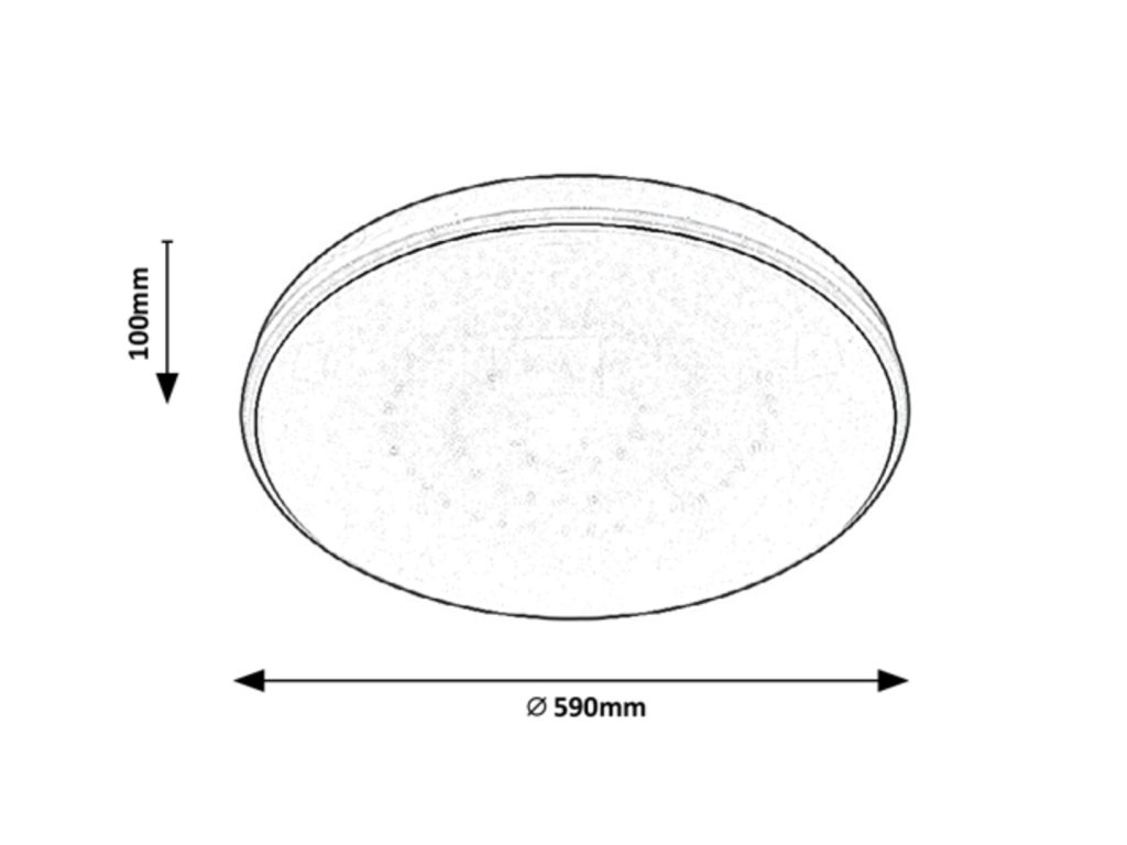 Svietidlo má priemer 590 mm a výšku 100 mm, čo ho robí kompaktným a zároveň dostatočne výrazným prvkom na stropnú inštaláciu.