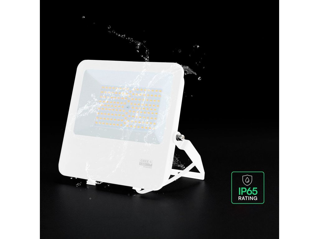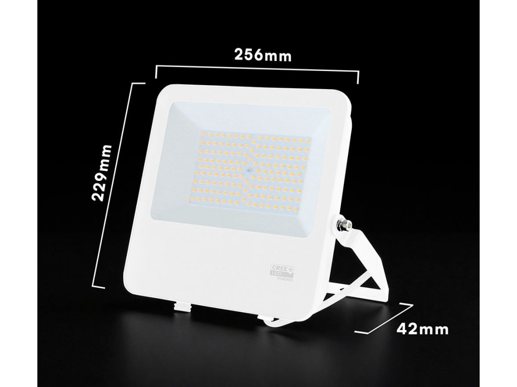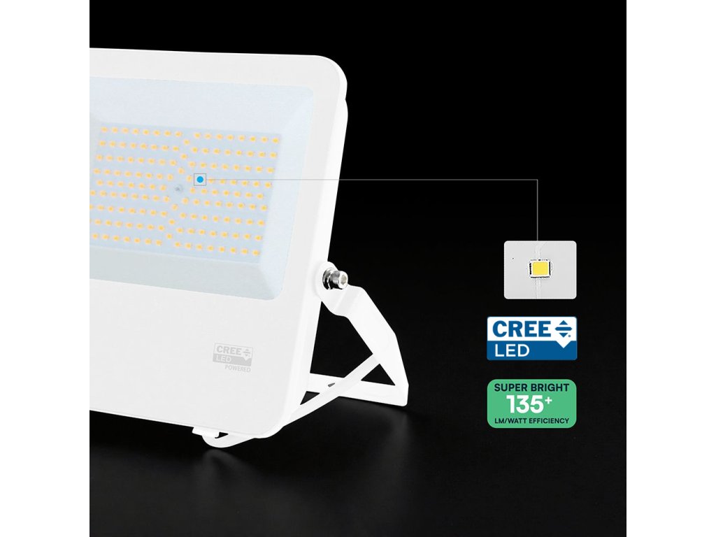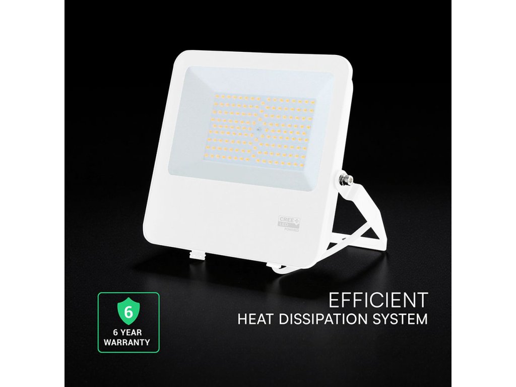 Robustné telo z prémiového hliníka v bielom prevedení s moderným odvodom tepla garantuje dlhú životnosť až 30 000 hodín a stabilnú prevádzku aj v náročných podmienkach. Povrchová úprava odolná proti korózii a krytiu IP65 chráni reflektor pred prachom, dažďom aj vlhkosťou, takže je ideálnou voľbou pre fasády budov, priemyselné areály, športoviská, parkoviská, reklamné plochy alebo komerčné priestory. Matné predné sklo zaisťuje rovnomerné rozptýlenie svetla a znižuje nežiaduce oslnenie.