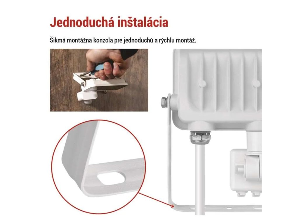Súčasťou konštrukcie je praktická šikmá montážna konzola, vďaka ktorej možno jednoducho nastaviť presný smer svietenia a upevniť reflektor na fasádu, stenu alebo iný povrch bez zložitých úprav. Na rýchle zapojenie slúži prívodný kábel s gumovým plášťom s dĺžkou 25 cm, ktorý zabezpečuje bezpečné a spoľahlivé pripojenie. Reflektor sa po zapnutí okamžite rozsvieti na plný výkon, pracuje bez blikania a vďaka modernej LED technológii výrazne znižuje prevádzkové náklady.