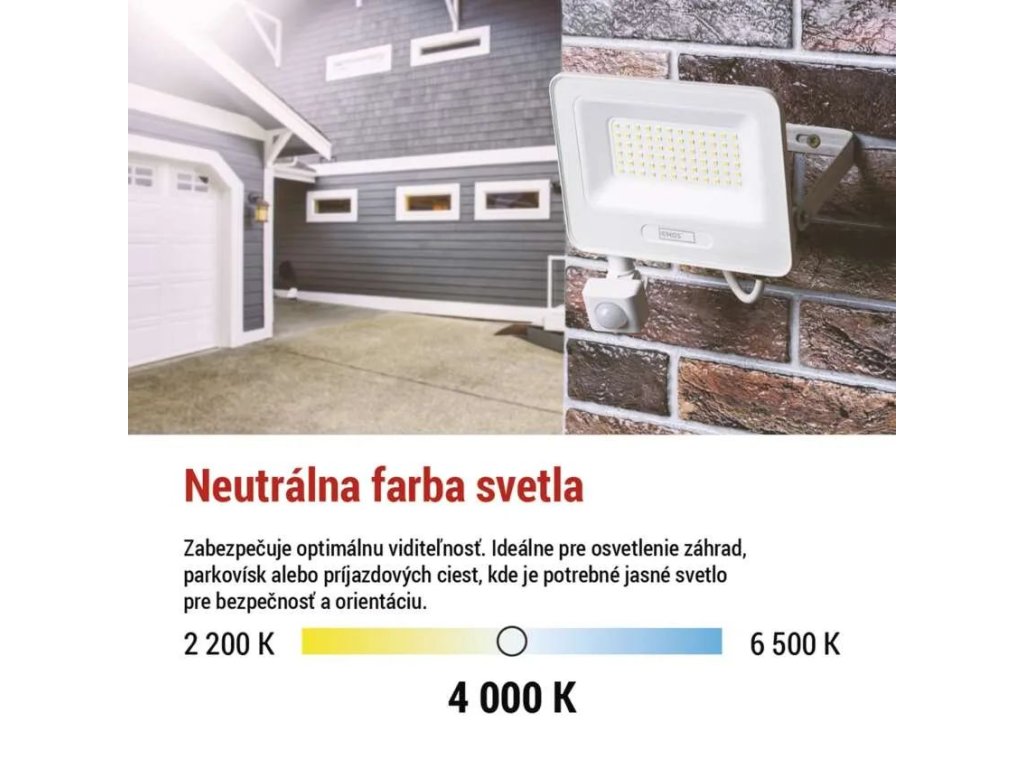 LED reflektor s výkonom 10 W prináša vysokú svetelnú účinnosť 100 lm/W a poskytuje silné a zároveň úsporné osvetlenie pre vonkajšie aj vnútorné použitie. Svetelný tok 1 000 lm spoľahlivo osvetlí fasády domov, príjazdové cesty, záhrady, garáže aj menšie firemné priestory. Neutrálna biela farba svetla s teplotou 4 000 K zabezpečuje prirodzenú viditeľnosť a rovnomerné osvetlenie bez rušivých farebných tónov, takže je vhodná na orientáciu, bezpečný pohyb aj prácu.