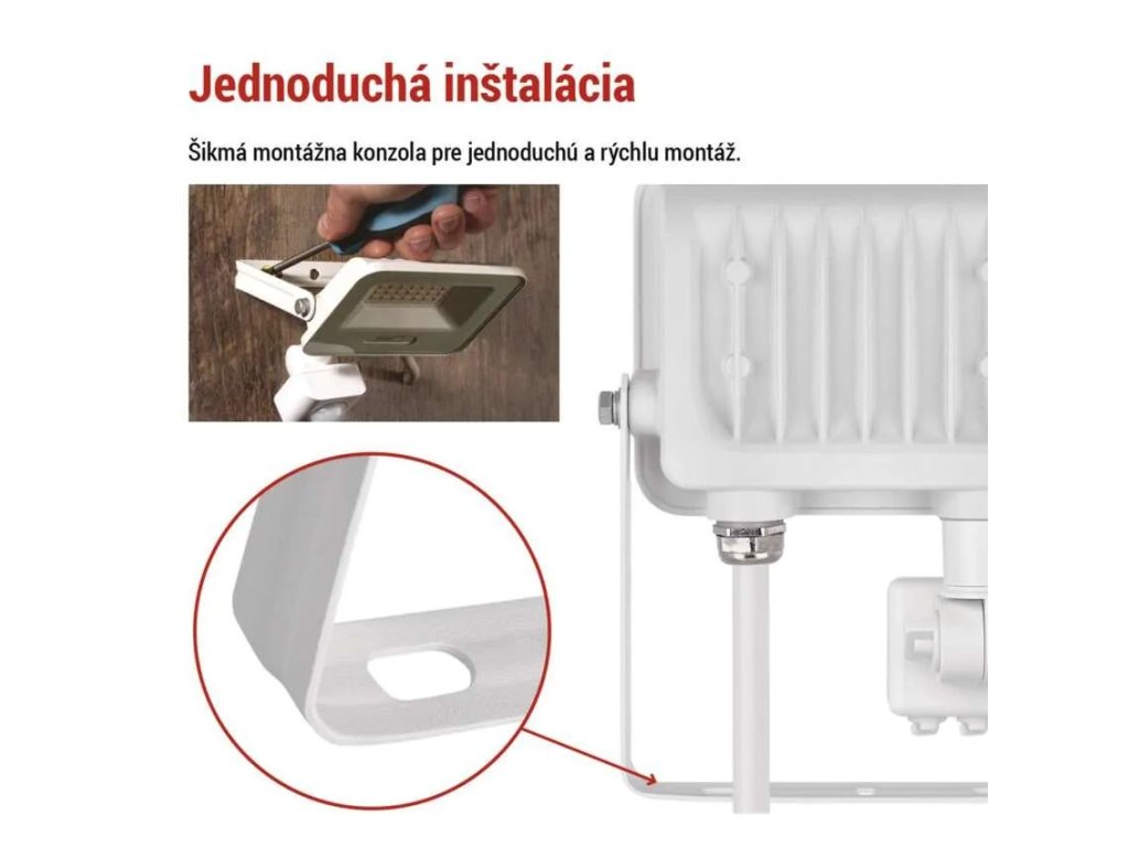 Súčasťou konštrukcie je praktická šikmá montážna konzola, vďaka ktorej možno jednoducho nastaviť presný smer svietenia a upevniť reflektor na fasádu, stenu alebo iný povrch bez zložitých úprav. Na rýchle zapojenie slúži prívodný kábel s gumovým plášťom s dĺžkou 25 cm, ktorý zabezpečuje bezpečné a spoľahlivé pripojenie. Reflektor sa po zapnutí okamžite rozsvieti na plný výkon, pracuje bez blikania a vďaka modernej LED technológii výrazne znižuje prevádzkové náklady.