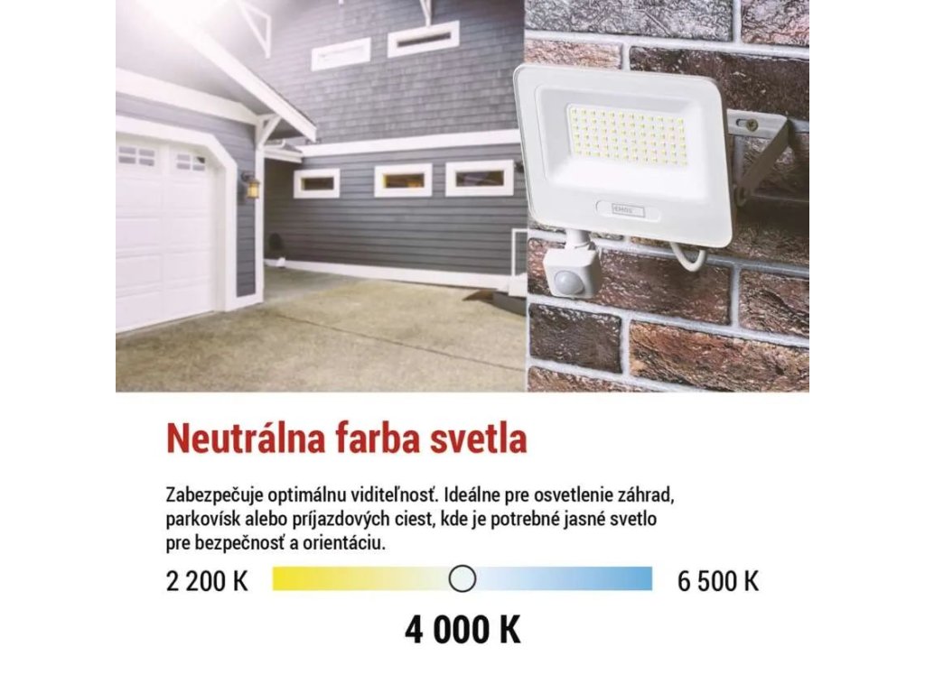 LED reflektor s výkonom 20 W prináša vysokú svetelnú účinnosť 100 lm/W a poskytuje silné a zároveň úsporné osvetlenie pre vonkajšie aj vnútorné použitie. Svetelný tok 2 000 lm spoľahlivo osvetlí fasády domov, príjazdové cesty, záhrady, garáže aj menšie firemné priestory. Neutrálna biela farba svetla s teplotou 4 000 K zabezpečuje prirodzenú viditeľnosť a rovnomerné osvetlenie bez rušivých farebných tónov, takže je vhodná na orientáciu, bezpečný pohyb aj prácu.
