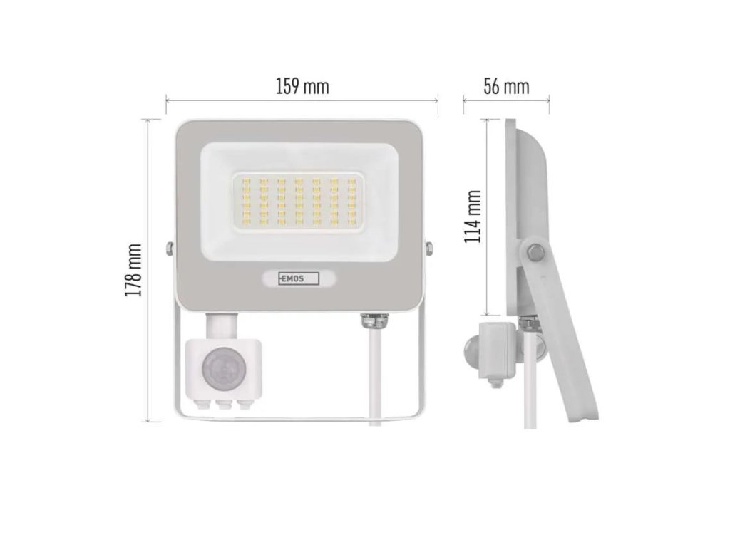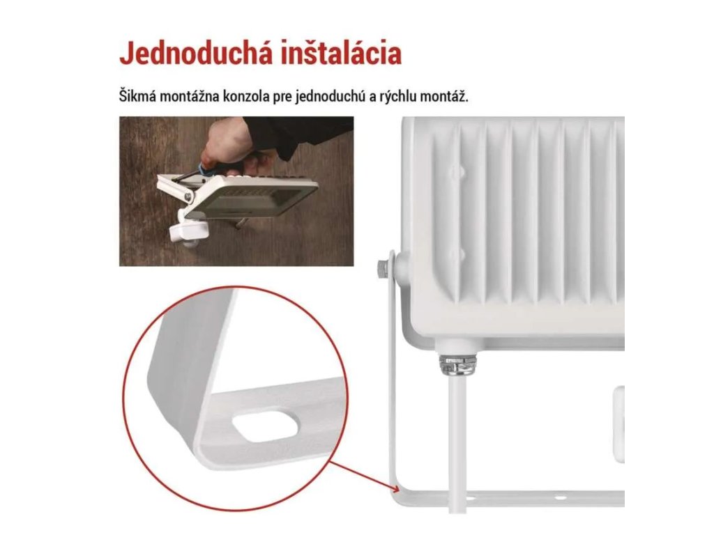 Súčasťou konštrukcie je praktická šikmá montážna konzola, vďaka ktorej možno jednoducho nastaviť presný smer svietenia a upevniť reflektor na fasádu, stenu alebo iný povrch bez zložitých úprav. Na rýchle zapojenie slúži prívodný kábel s gumovým plášťom s dĺžkou 25 cm, ktorý zabezpečuje bezpečné a spoľahlivé pripojenie. Reflektor sa po zapnutí okamžite rozsvieti na plný výkon, pracuje bez blikania a vďaka modernej LED technológii výrazne znižuje prevádzkové náklady.