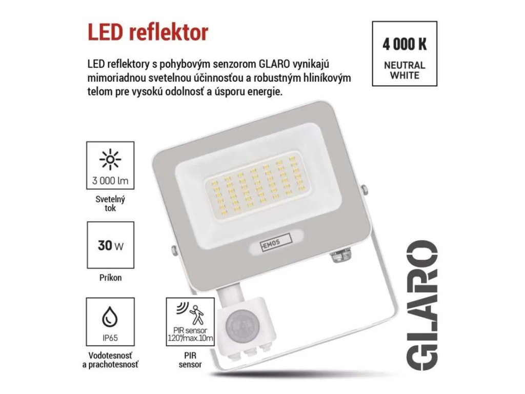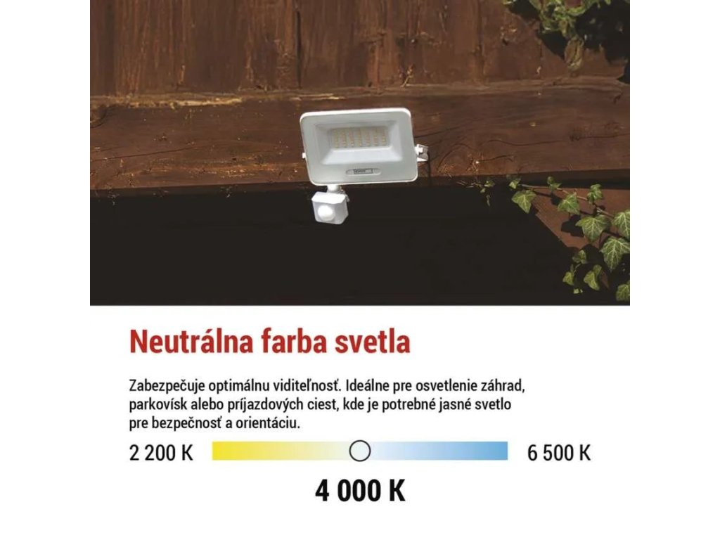 LED reflektor s výkonom 30 W prináša vysokú svetelnú účinnosť 100 lm/W a poskytuje silné a zároveň úsporné osvetlenie pre vonkajšie aj vnútorné použitie. Svetelný tok 3 000 lm spoľahlivo osvetlí fasády domov, príjazdové cesty, záhrady, garáže aj menšie firemné priestory. Neutrálna biela farba svetla s teplotou 4 000 K zabezpečuje prirodzenú viditeľnosť a rovnomerné osvetlenie bez rušivých farebných tónov, takže je vhodná na orientáciu, bezpečný pohyb aj prácu.