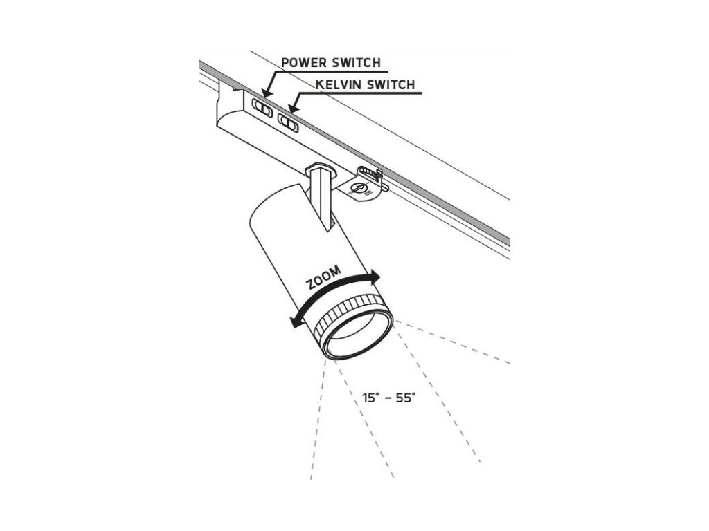 Svietidlo umožňuje priame nastavenie výkonu na tele reflektora medzi 15 W, 20 W alebo 30 W a zároveň ponúka voľbu farby svetla medzi teplou bielou 2700 K, dennou bielou 4000 K a studenou bielou 6000 K. Nastaviteľný vyžarovací uhol v rozsahu 15–55° umožňuje presné smerovanie svetla podľa charakteru priestoru alebo vystavených objektov.