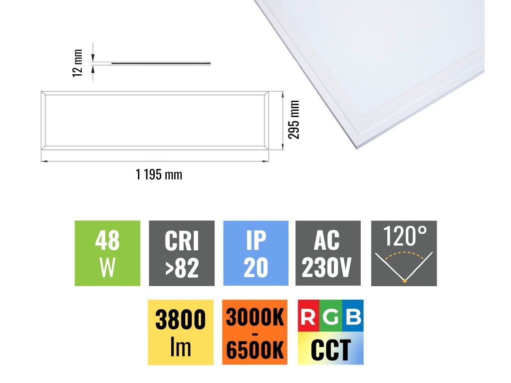 Podhľadový LED panel s bielym rámčekom a skvelou svietivosťou. U tohto modelu RGB+CCT je možné meniť farebnou škálou RGB a zároveň teplotu bieleho svetla v rozmedzí od 3000K do 6500K. Tento panel je možné využiť na vytvorenie rôznych atmosfér v miestnostiach. Panel s výkonom 48W a rozmerom 300 x 1200mm sa skvele hodí do podhľadových aplikácií. Najčastejšie je používaný do kazetových stropov, kde stačí iba zapojiť panel k sieti. Napájací zdroj LED panelu má výstupné napätie DC 24V.