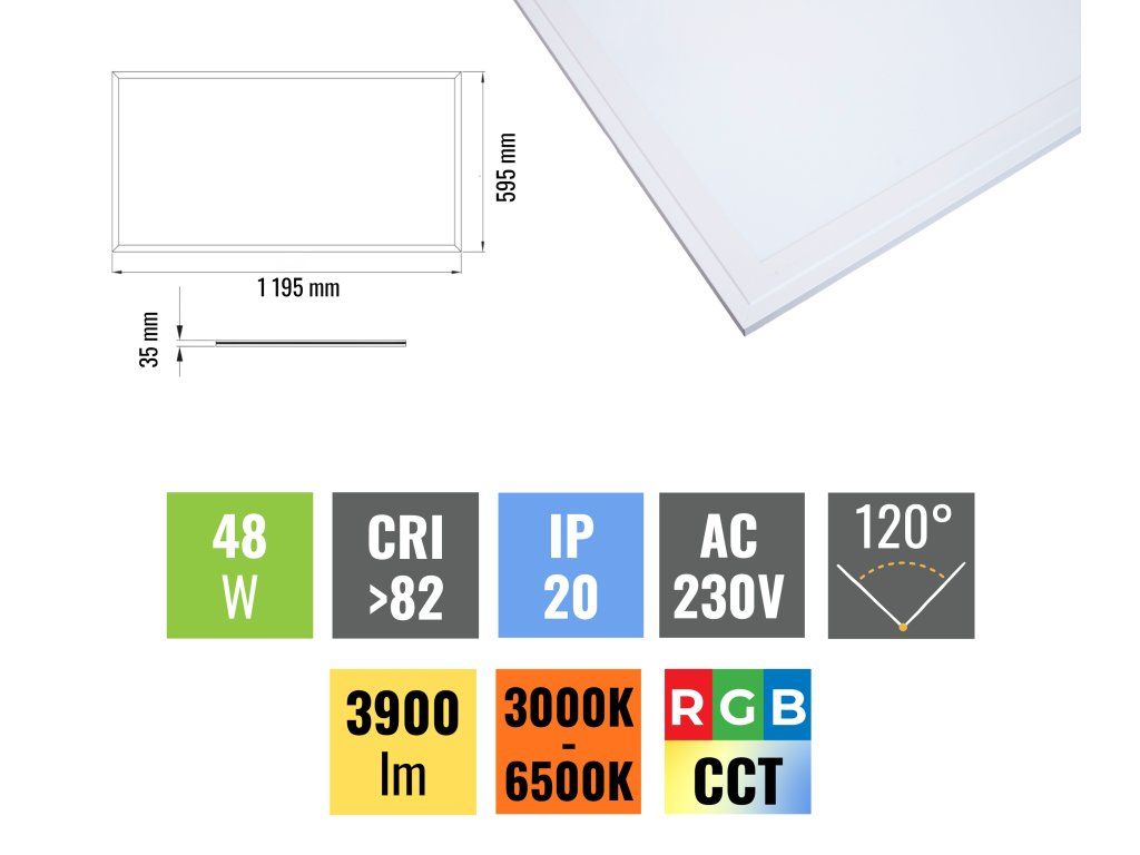 Podhľadový LED panel s bielym rámčekom a skvelou svietivosťou. U tohto modelu RGB+CCT je možné meniť farebnou škálou RGB a zároveň teplotu bieleho svetla v rozmedzí od 3000K do 6500K. Tento panel je možné využiť na vytvorenie rôznych atmosfér v miestnostiach. Panel s výkonom 48W a rozmerom 600 x 1200mm sa skvele hodí do podhľadových aplikácií. Najčastejšie je používaný do kazetových stropov, kde stačí iba zapojiť panel k sieti. Napájací zdroj LED panelu má výstupné napätie DC 24V.