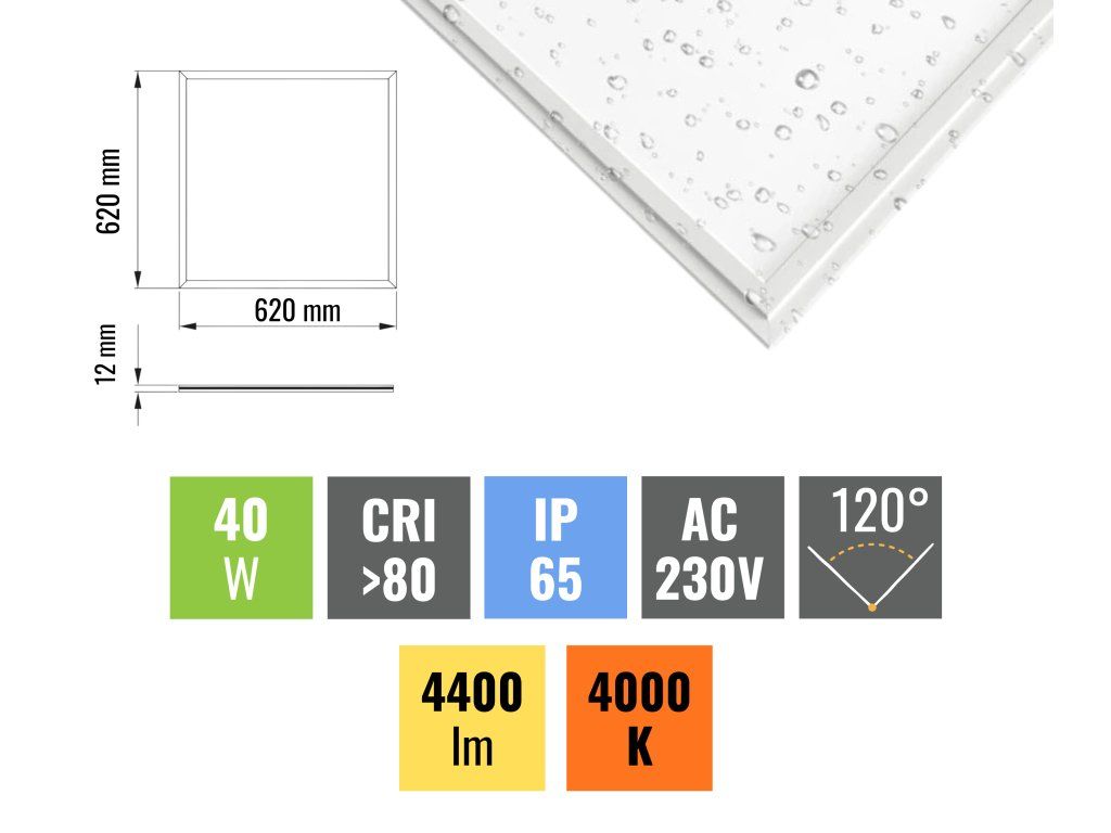 Vďaka odolnej konštrukcii s krytím IP65 a vodeodolnému LED driveru je panel vhodný aj do prostredia s vyššou vlhkosťou či prašnosťou. Uplatní sa napríklad v kuchyniach gastroprevádzok, v sprchách a šatniach športových a fitness centier, v laboratóriách, potravinárskych prevádzkach, autoumývačkách alebo vo vonkajších priestoroch.