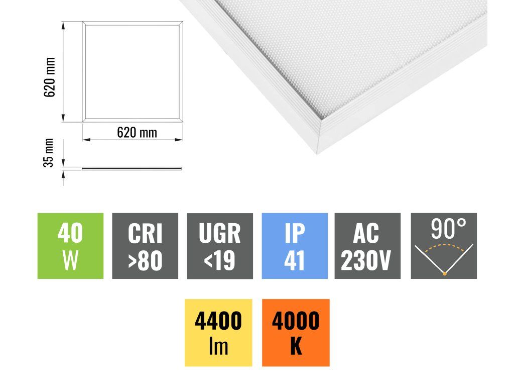 LED panel s prizmatickým difúzorom znižujúcim oslnenie za skvelú cenu. Vďaka parametru UGR <19 (neoslňuje) sa hodí predovšetkým do kancelárií a iných pracovísk, kde je kladený dôraz na svetlenú pohodu. Tento panel s výkonom 40W a rozmerom 62 x 62cm sa skvele hodí do podhľadových aplikácií. Najčastejšie je používaný do kazetových stropov, kde stačí iba zapojiť panel k sieti. Nie je potrebné žiadne ďalšie príslušenstvo pre montáž panelov.
