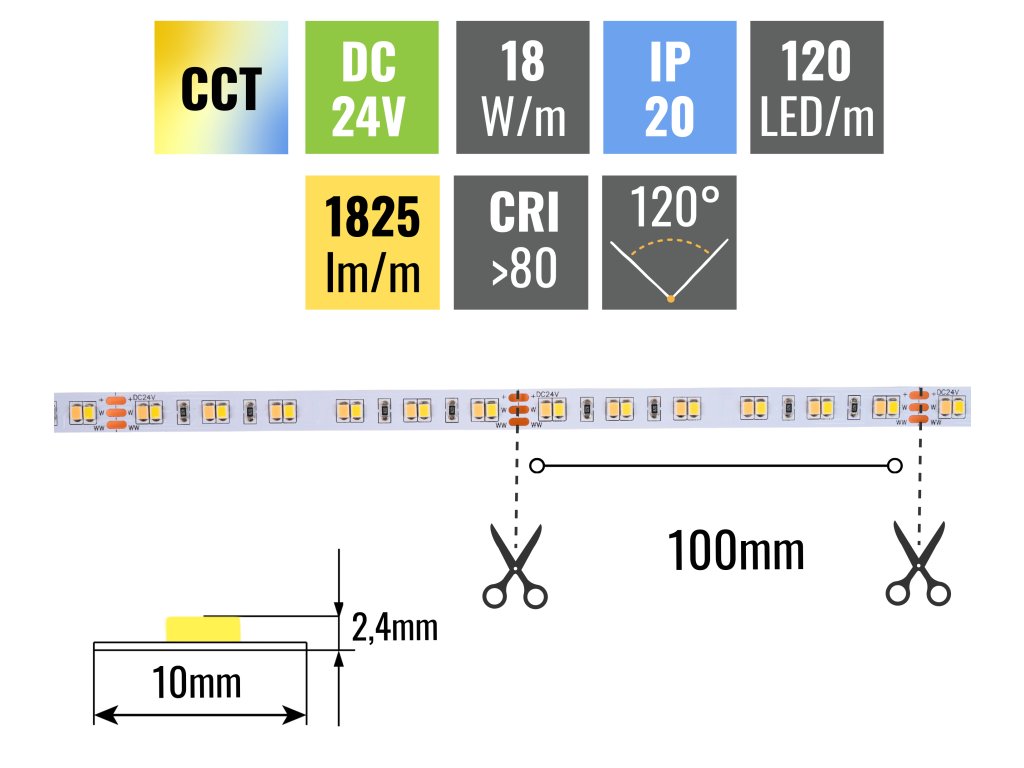 CCT LED pásik 18W/m 24V bez krytia IP20