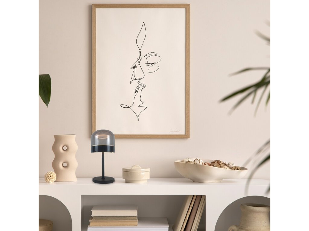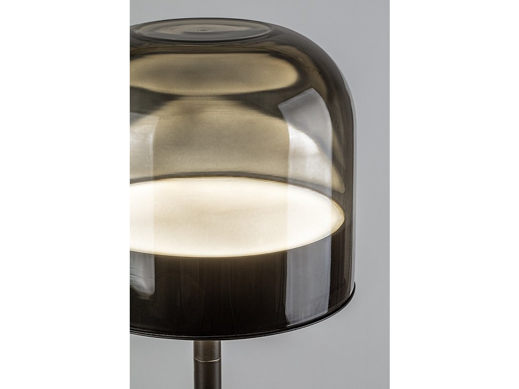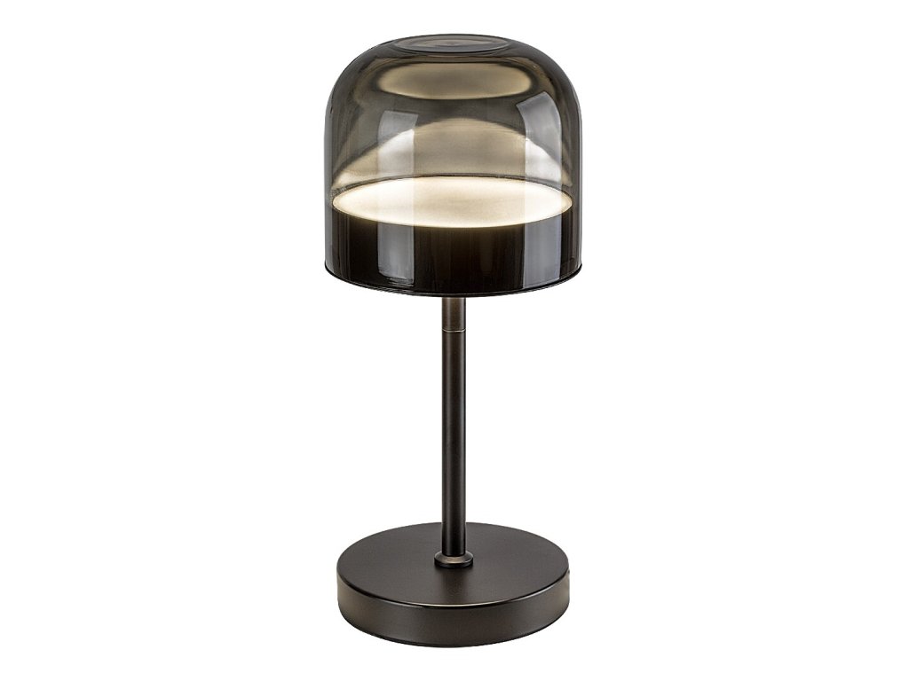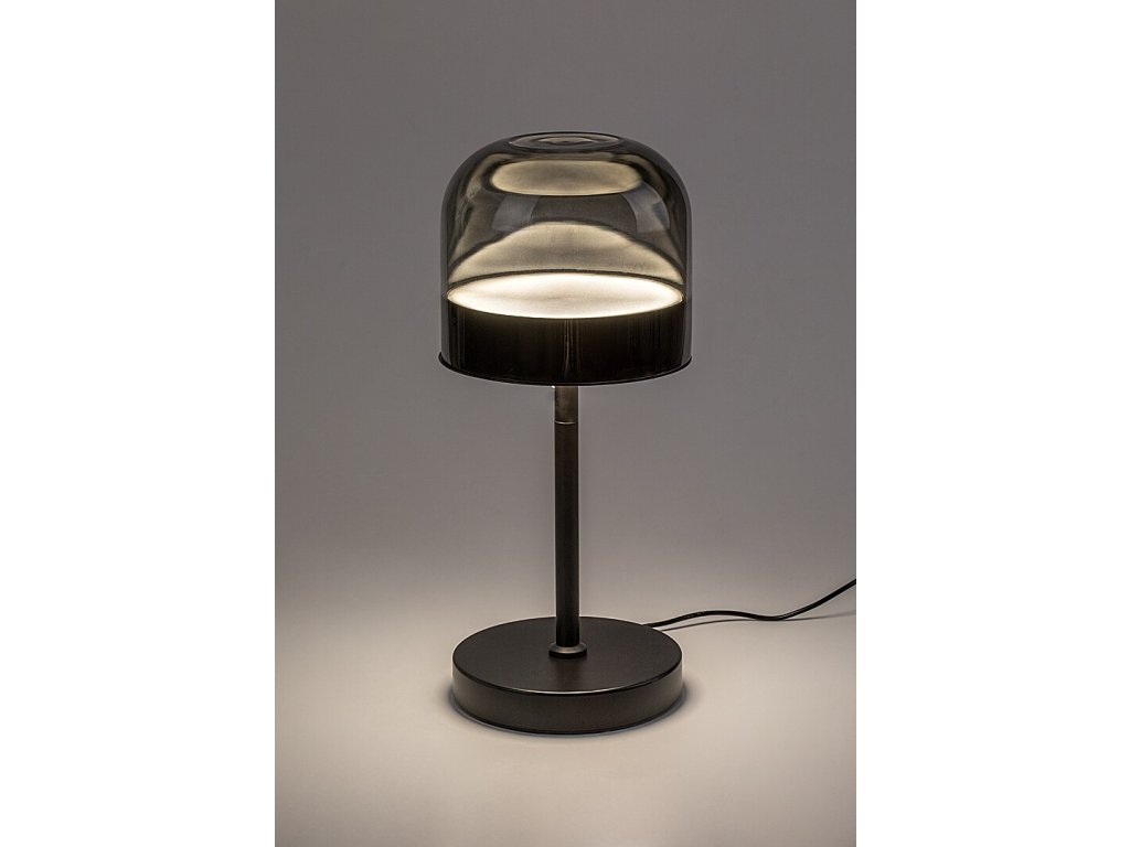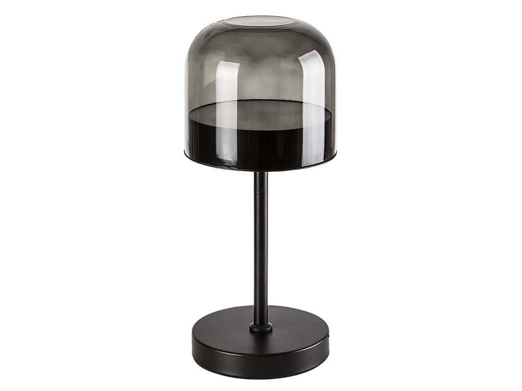 Lampička má kovové telo v čiernom prevedení, ktoré dopĺňa elegantné tienidlo z dymového skla. Stabilná okrúhla základňa zaisťuje bezpečné postavenie na stole či nočnom stolíku a nadčasový dizajn sa ľahko začlení do moderného aj klasického interiéru.