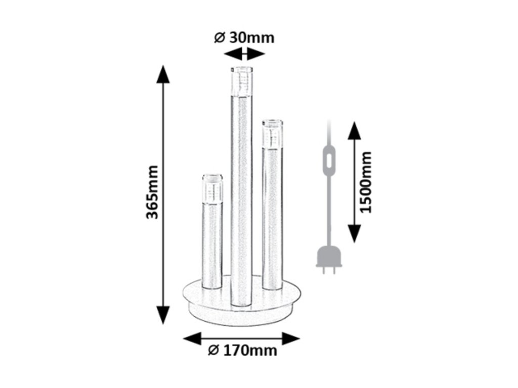 Celková výška lampy dosahuje približne 365 mm, priemer okrúhlej základne je 170 mm a priemer jednotlivých svetelných hlavíc je 30 mm. Dĺžka prívodného kábla je 1,5 m, čo poskytuje dostatočnú flexibilitu pri umiestnení lampy na stole, komode alebo nočnom stolíku. Stolná lampa Ramira predstavuje výrazné dizajnové svietidlo s univerzálnym využitím v modernom interiéri.