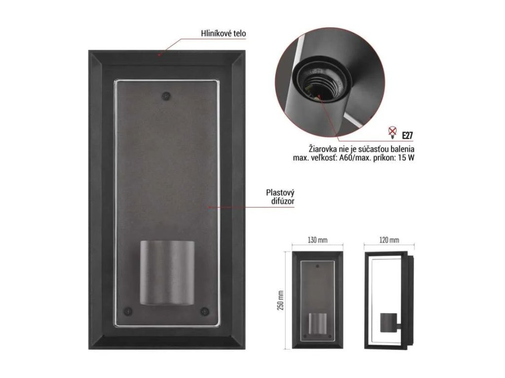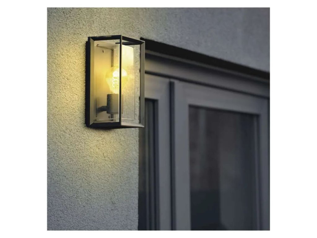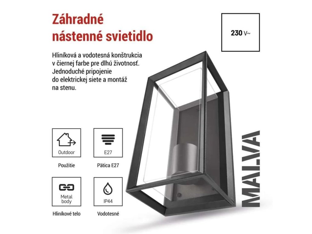 Záhradné fasádne svietidlo MALVA v elegantnej čiernej farbe zaujme svojim moderným geometrickým tvarom, ktorý dodá exteriéru čistý a štýlový vzhľad. Minimalistické hliníkové telo dopĺňajú číre plastové steny, ktoré nechávajú vyniknúť tvar žiarovky a zaisťujú maximálny prestup svetla. Ideálne je pre osvetlenie vstupných priestorov, fasád domov, pergol aj záhradných múrikov.