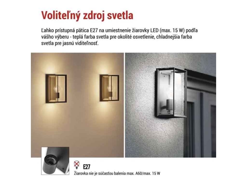 Svietidlo je kompatibilné so žiarovkou s päticou E27 s maximálnym výkonom 15 W, ktorá nie je súčasťou balenia. Môžete zvoliť teplejší tón pre ambientné osvetlenie alebo studenšiu farbu pre lepšiu viditeľnosť. Žiarovka nie je súčasťou balenia, takže si svetelný zdroj ľahko prispôsobíte svojim preferenciám.