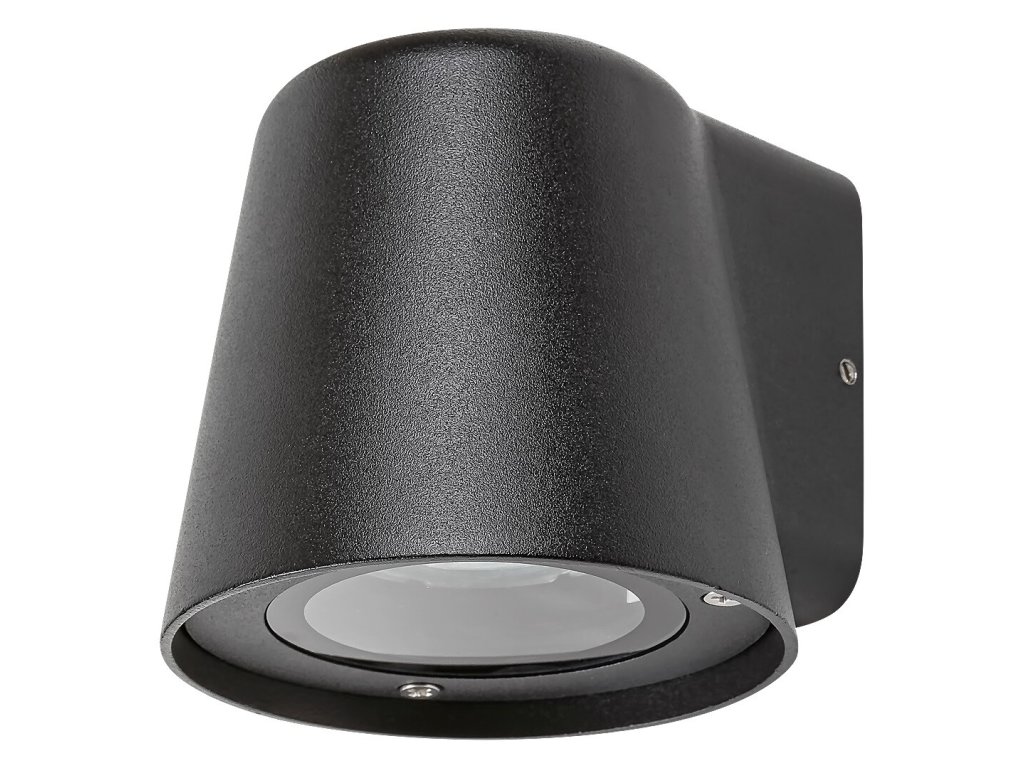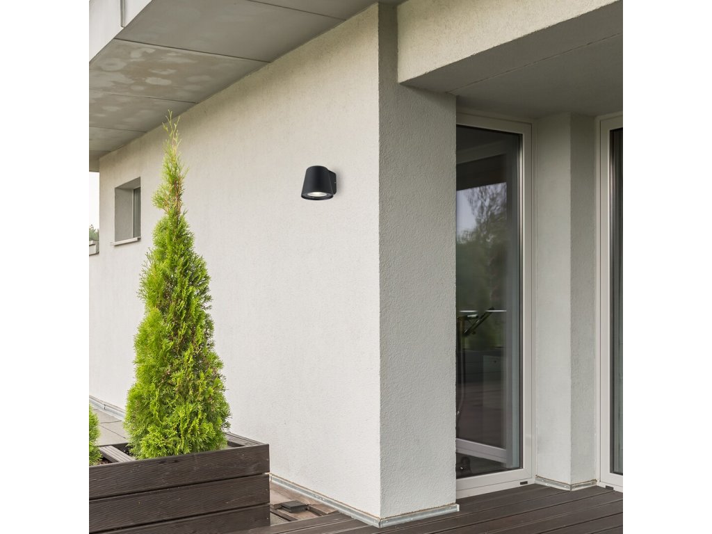 Vonkajšie nástenné svietidlo Mandal zaujme svojim moderným designom a praktickým prevedením. Matné čierne hliníkové telo svietidla sa smerom dole rozširuje a elegantne dopĺňa priehľadné sklenené tienidlo, ktoré poskytuje jasné a sústredené osvetlenie.