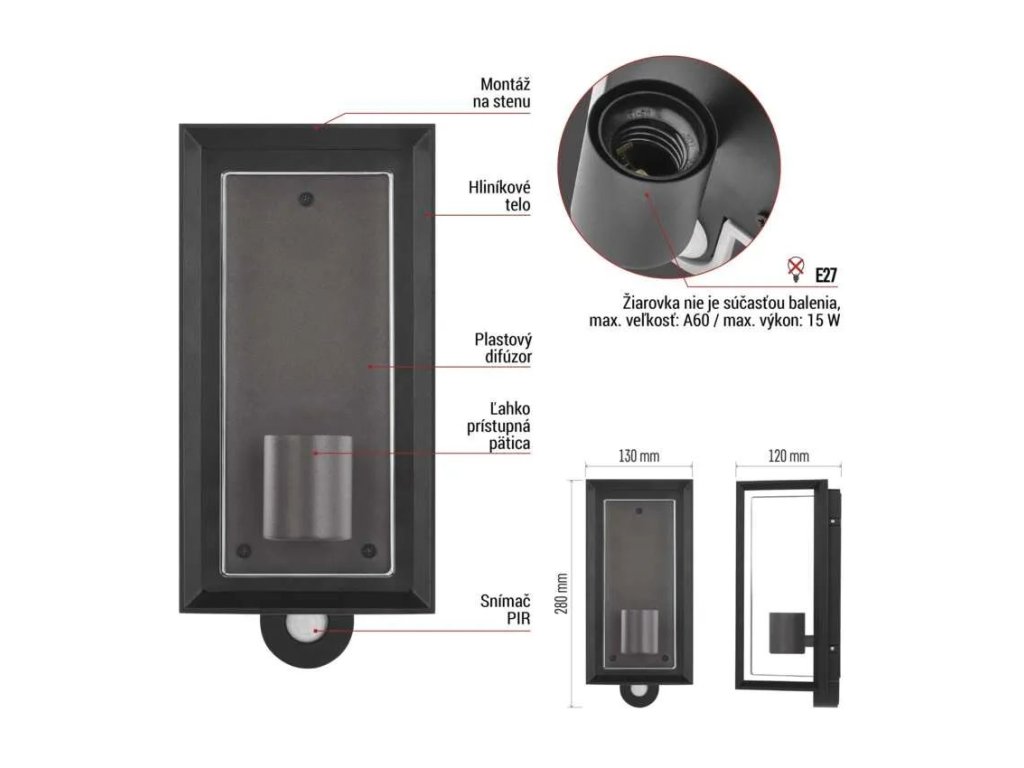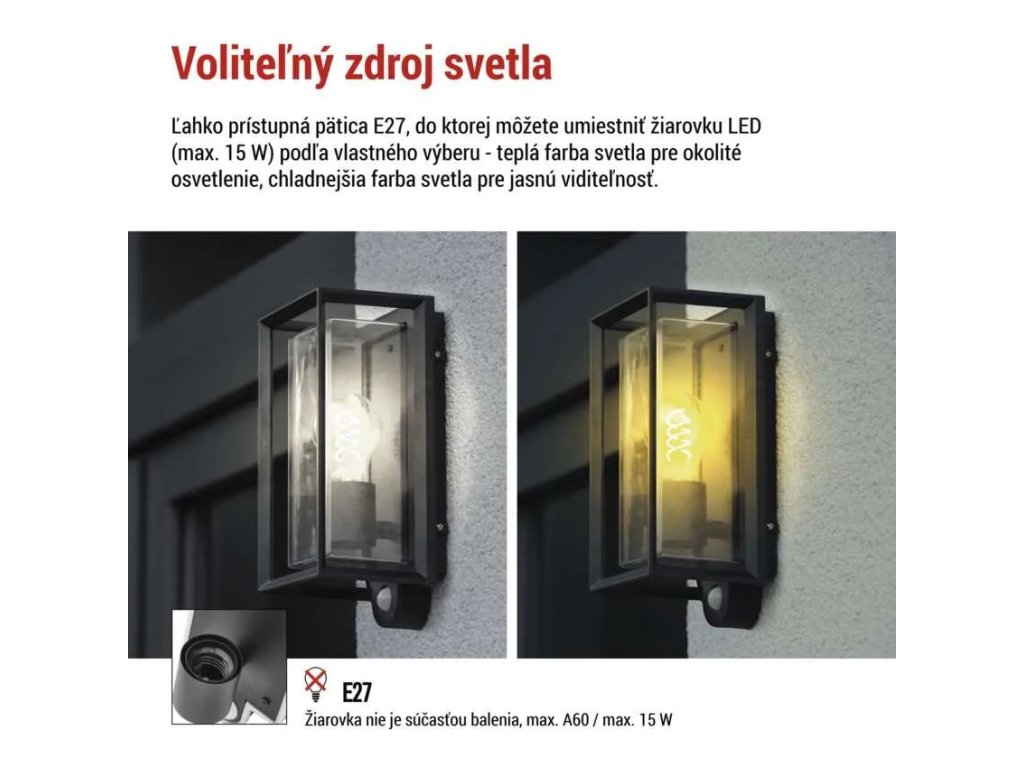 Súčasťou svietidla je pohybové čidlo s dosahom až 10 metrov a snímacím uhlom 110°, ktoré zaistí, že sa svetlo rozsvieti len vtedy, keď je skutočne potrebné.