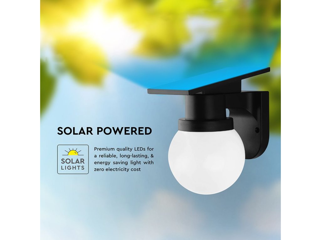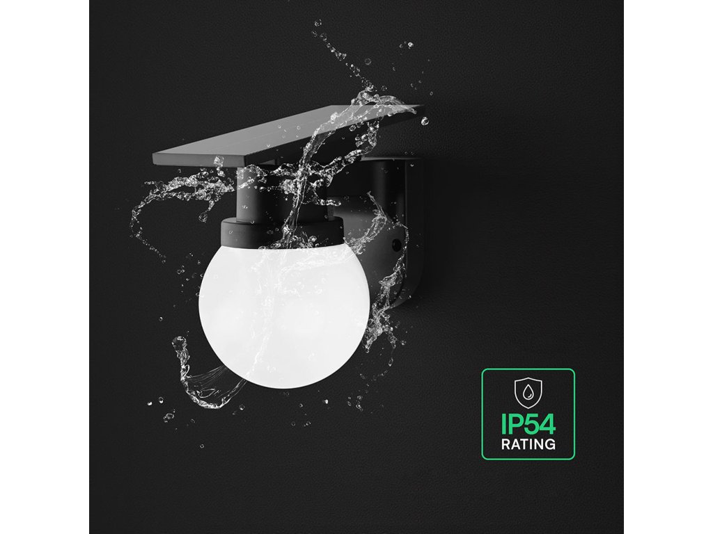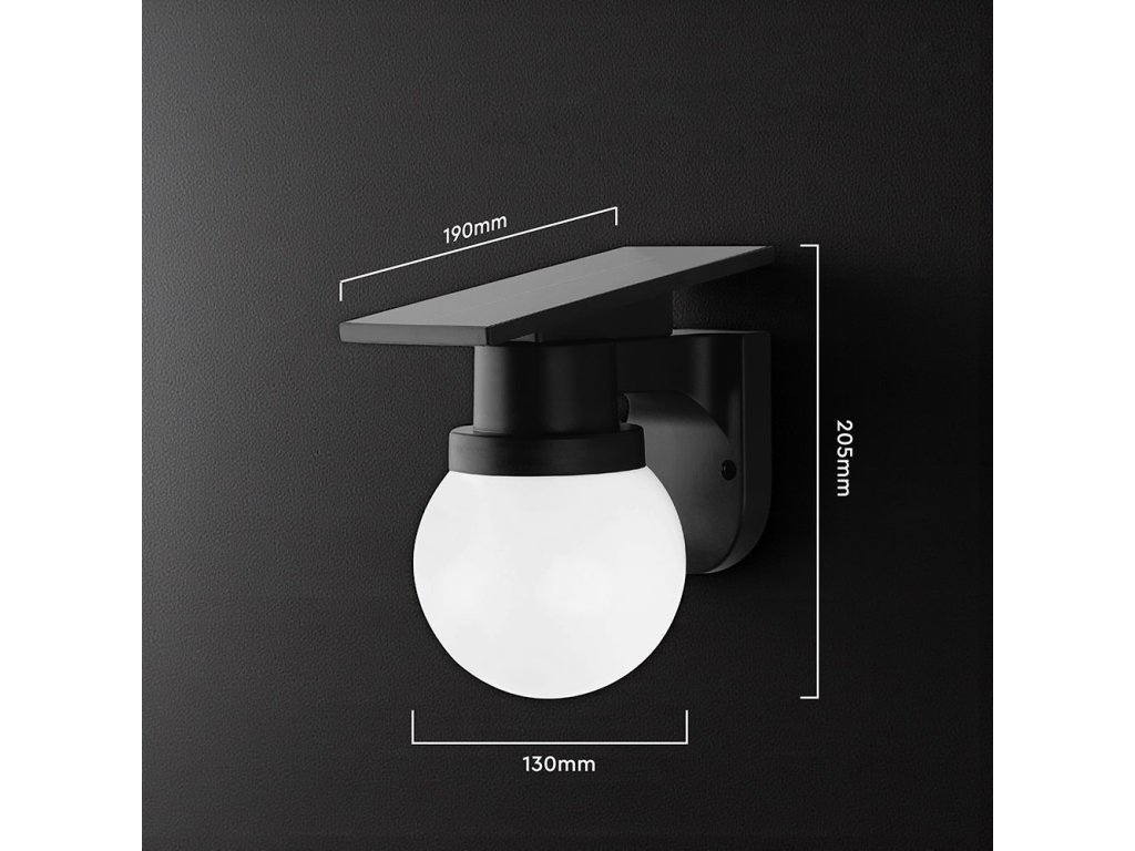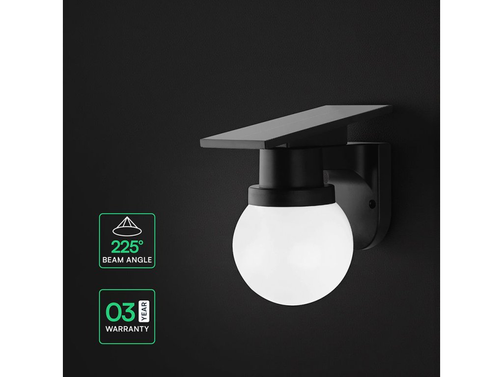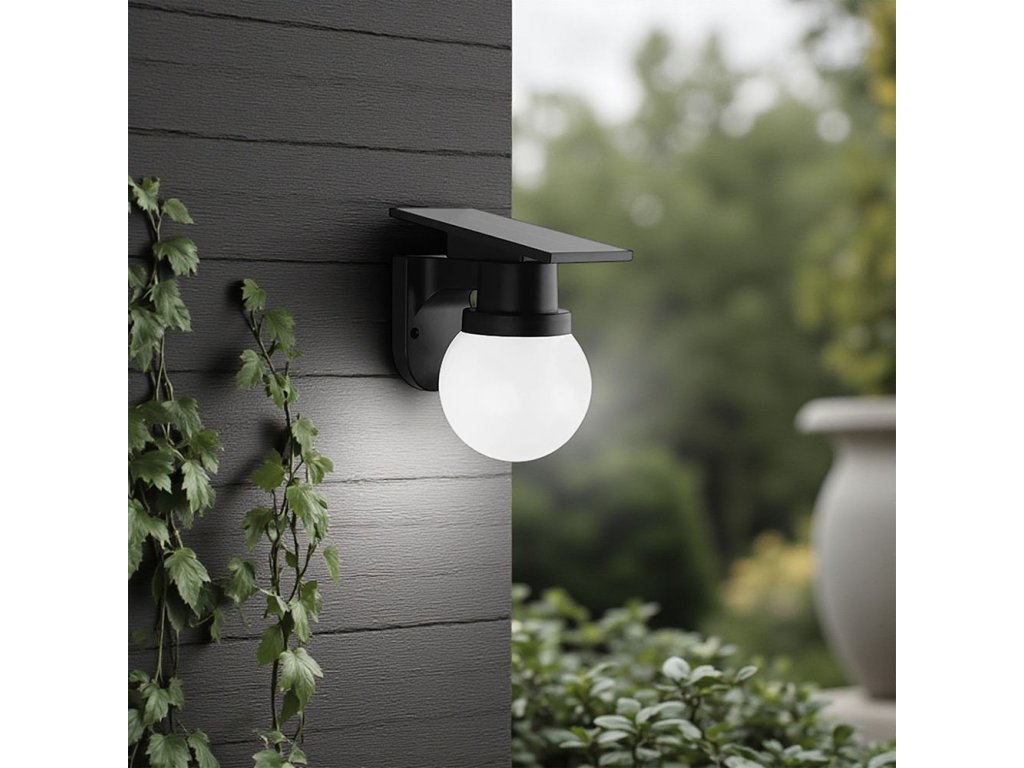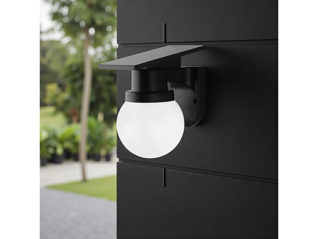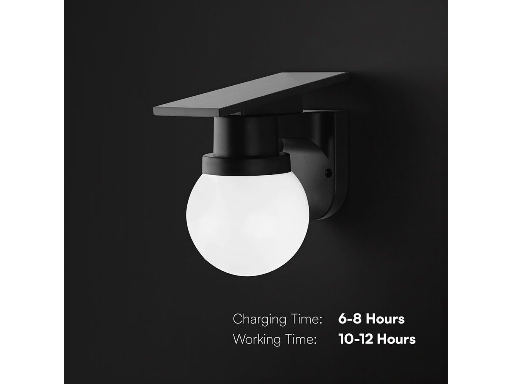 Čierne solárne LED fasádne svietidlo s guľovým difúzorom ponúka elegantný a moderný spôsob vonkajšieho osvetlenia, ktorý nevyžaduje žiadne káblové napájanie. Monokryštalický solárny panel DC 5 V / 2,3 W počas dňa dobíja integrovanú Li-Ion batériu 3,7 V 1800 mAh. V závislosti na svetelných podmienkach trvá nabíjanie približne 6 až 8 hodín, pričom svietidlo potom dokáže svietiť po dobu 10 až 12 hodín. Prevádzka je teda plne autonómna a prispôsobená bežným vonkajším podmienkam.