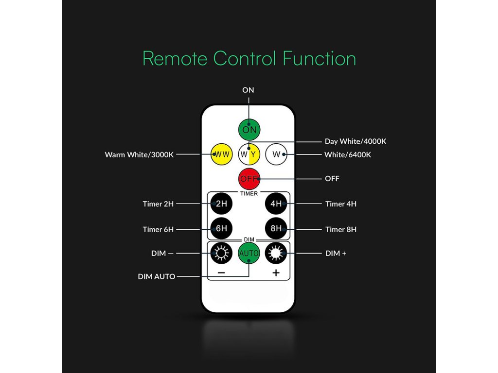 Súčasťou balenia je diaľkový ovládač, ktorý umožňuje pohodlne ovládať zapnutie a vypnutie, nastavovať teplotu svetla aj jas. Možno voliť medzi teplou (2700K), neutrálnou (3200K) a studenou bielou (5000K), takže svetlo ľahko prispôsobíte aktuálnej atmosfére alebo charakteru priestoru. K dispozícii je tiež funkcia stmievania, časovač na 2, 4, 6 alebo 8 hodín a automatický režim, v ktorom svietidlo podľa potreby samo reguluje jas. Integrovaná súmraková funkcia zaisťuje, že sa svetlo v noci samo zapne a za úsvitu opäť vypne, ak je fyzický prepínač nastavený do polohy ON.