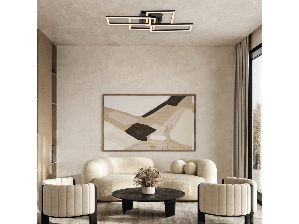 Stropné svietidlo Drusus predstavuje moderné a technologicky vyspelé riešenie osvetlenia, ktoré v interiéri zaujme výrazným geometrickým dizajnom aj vysokou funkčnosťou. Konštrukcia je tvorená štvorcovými svetelnými prvkami rôznych veľkostí, ktoré sú vzájomne prepojené a upevnené k stropu pomocou štvorcovej dekoratívnej montážnej základne. Kombinácia čierneho kovového tela a bieleho plastového tienidla pôsobí elegantne a nadčasovo, vďaka čomu sa svietidlo výborne hodí do moderných obývacích izieb, jedální aj spální, vrátane väčších a otvorených priestorov.