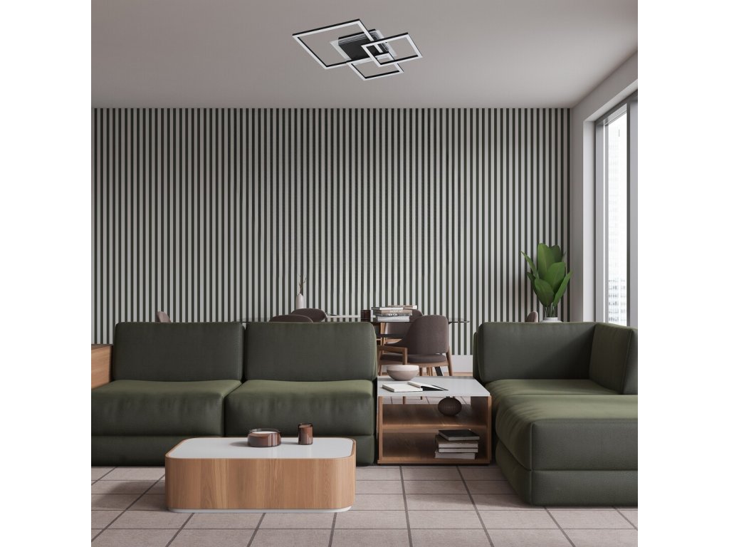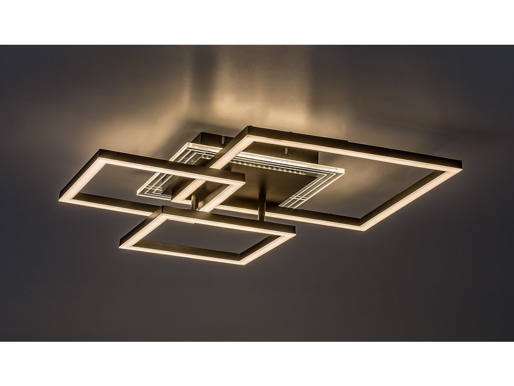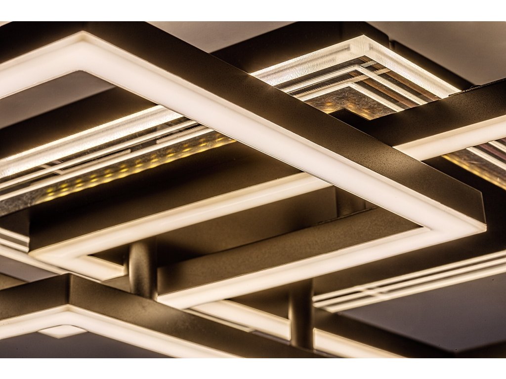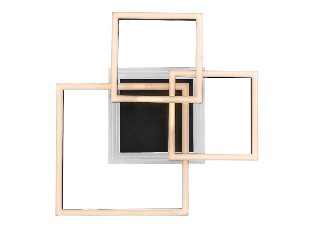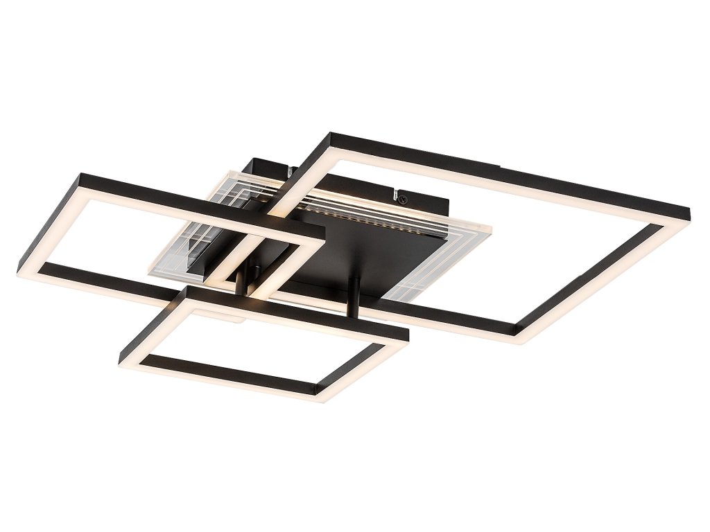 Stropné svietidlo Ottavia v tejto väčšej variante zaujme výrazným moderným dizajnom tvoreným viacerými pretínajúcimi sa štvorcovými prvkami rôznych veľkostí. Kombinácia čierneho kovového tela a bieleho akrylového tienidla pôsobí elegantne, nadčasovo a zároveň dynamicky, vďaka čomu sa svietidlo stáva dominantným prvkom interiéru. Štvorcové svetelné rámy sú uchytené na čiernej štvorcovej dekoratívnej montážnej základni, ktorá celý celok vizuálne zjednocuje a podčiarkuje jeho geometrický charakter.