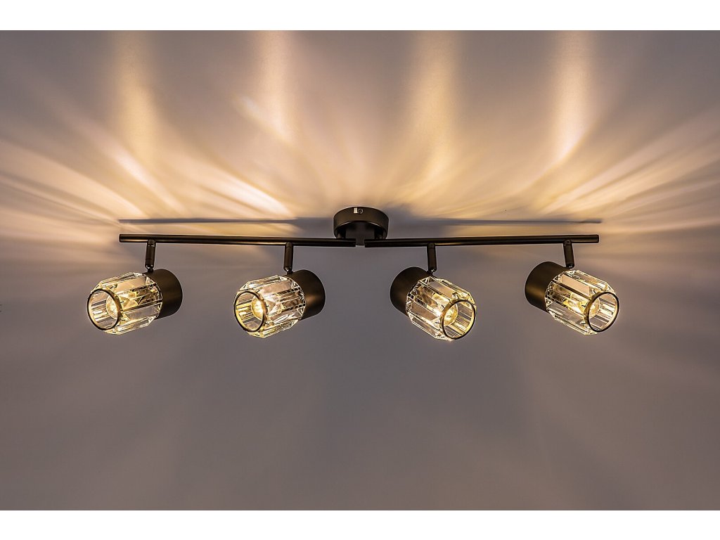 Stropné svietidlo Venaro so štyrmi svetelnými prvkami ponúka nadčasový dizajn, ktorý sa ľahko kombinuje s modernými aj klasicky ladenými interiérmi. Čierna kovová konštrukcia je doplnená valcovými sklenenými tienidlami s výrazným kryštálovým efektom, ktoré dodávajú svietidlu dekoratívny charakter a vytvárajú zaujímavé svetelné odlesky.
