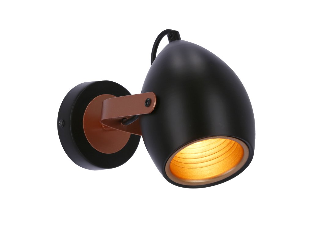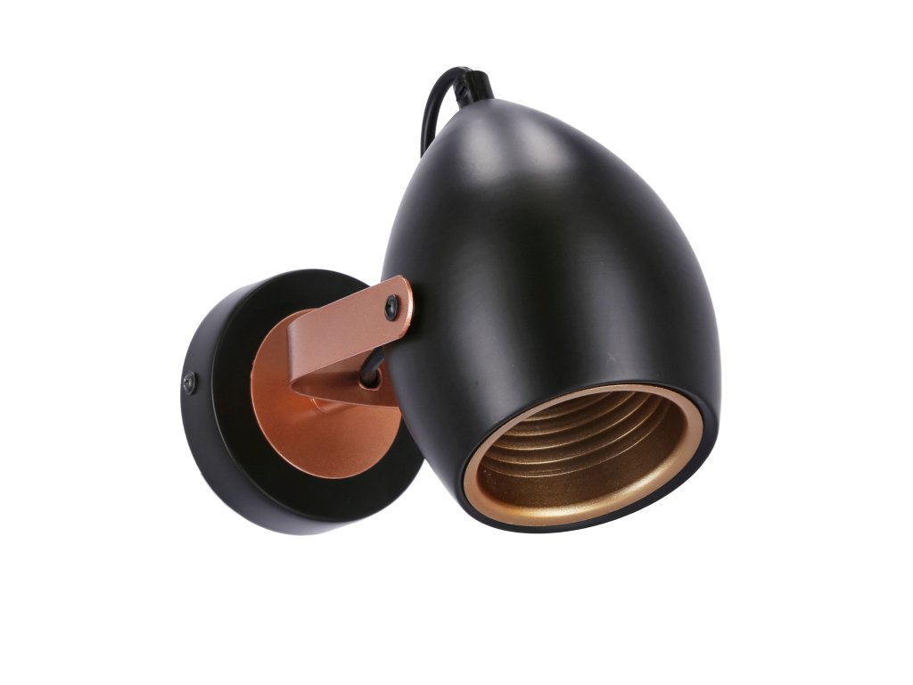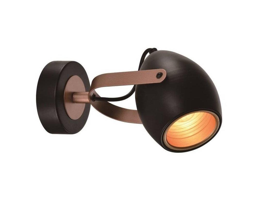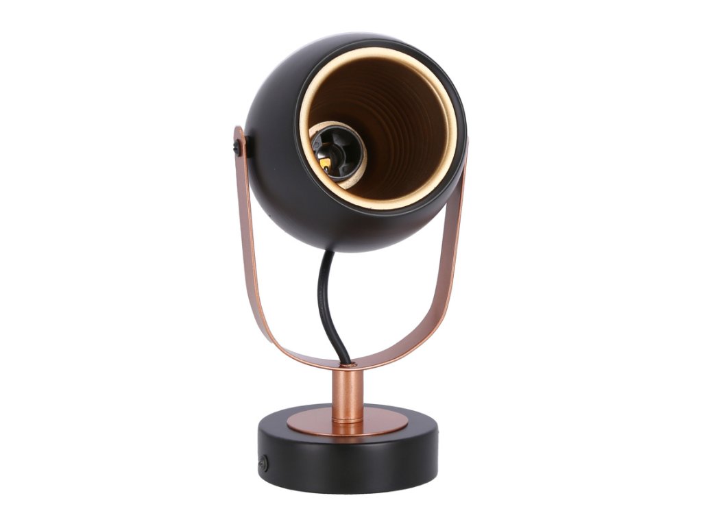 Stropné/nástenné LED svietidlo s päticou 1x E14 s výkonom max. 40W. Rozmer tohto svietidla je 230x160x100mm. Svietidlo je vhodné do industriálneho alebo moderného interiéru. Skvele sa bude vynímať v spálni nad posteľou. Výhodou je možnosť nastavenia sklonu tienidla do rôznych smerov a tým nasmerovať svetlo presne tam, kam potrebujete. Svietidlo je vyrobené z kovu matné čiernej farby s medeným vnútrom.